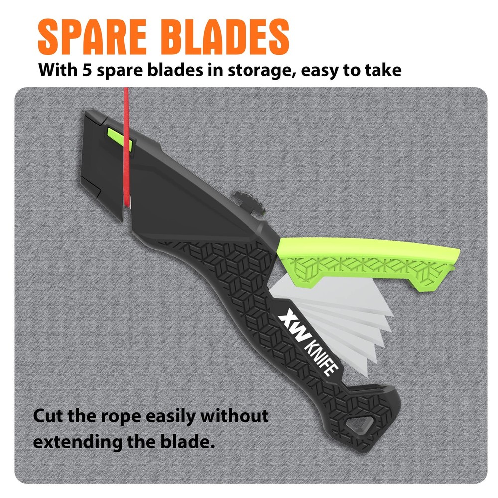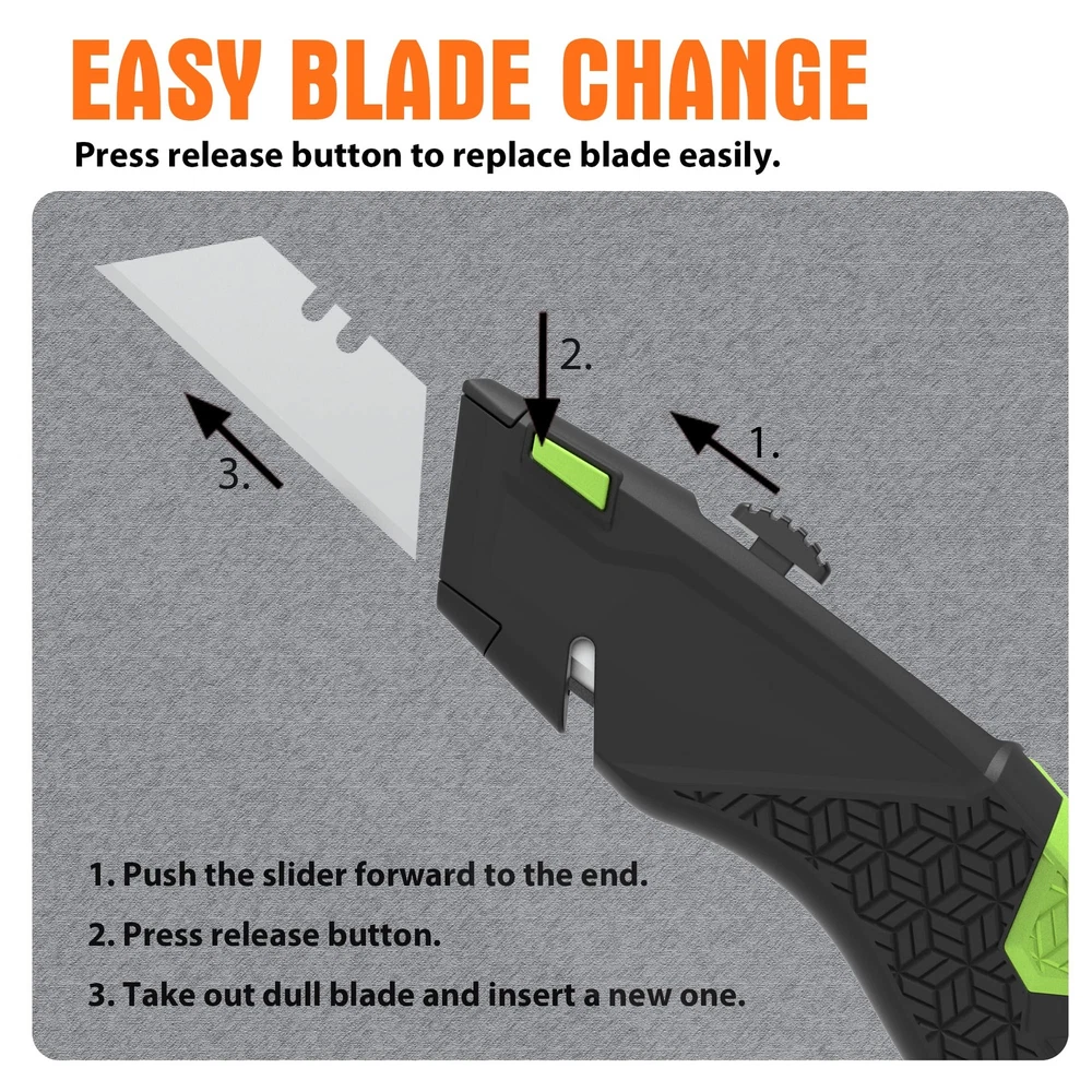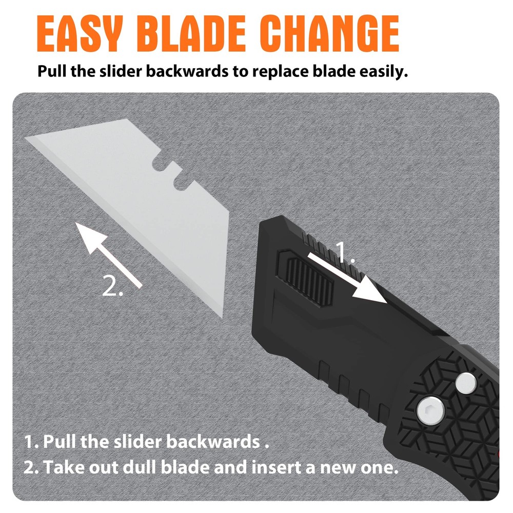 utility knife is well designed for sharpness and durability. The utility knife is made of fiberglass & reinforced nylon. Quick-change mechanism makes it easy and convenient to use. Can be used for office, household, workshop and warehouse. PLENTY: Including 2 pcs folding utility knives in different colors, 2 pcs retractable utility knives in different colors, total 20 pcs SK5 razor blades. DURABLE: Retractable knife is made of reinforced nylon which possesses high strength and durability. Folding knife is made of zinc alloy blade holder and reinforced nylon handle. Comfortable and non-slip handle provides excellent grip. LOCK-BACK & RETRACTABLE: Lock-back design for the folding utility knife. Press down the metal release button to fold or unfold the knife. 3-position retractable for different cutting depths. QUICK BLADE CHANGE: The release button is for easy blade change. BLADE STORAGE: Blade storage compartment for quick access. 3 spare blades are stored in the handle of the folding knife. 5 spare blades are stored in the handle of the retractable knife.
