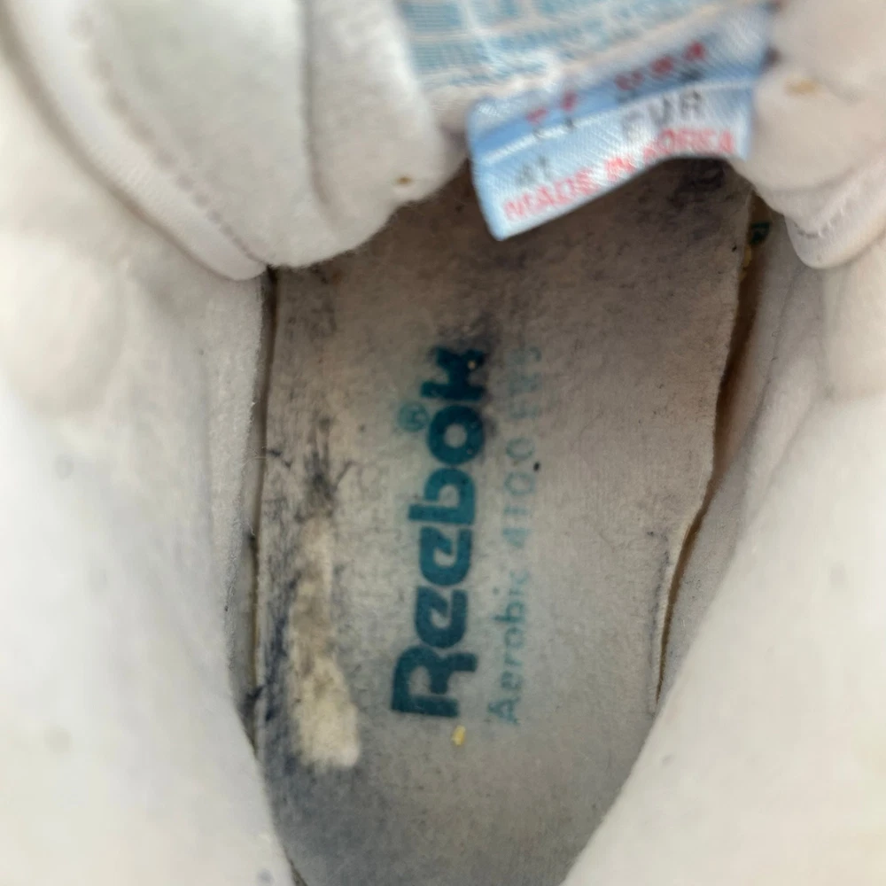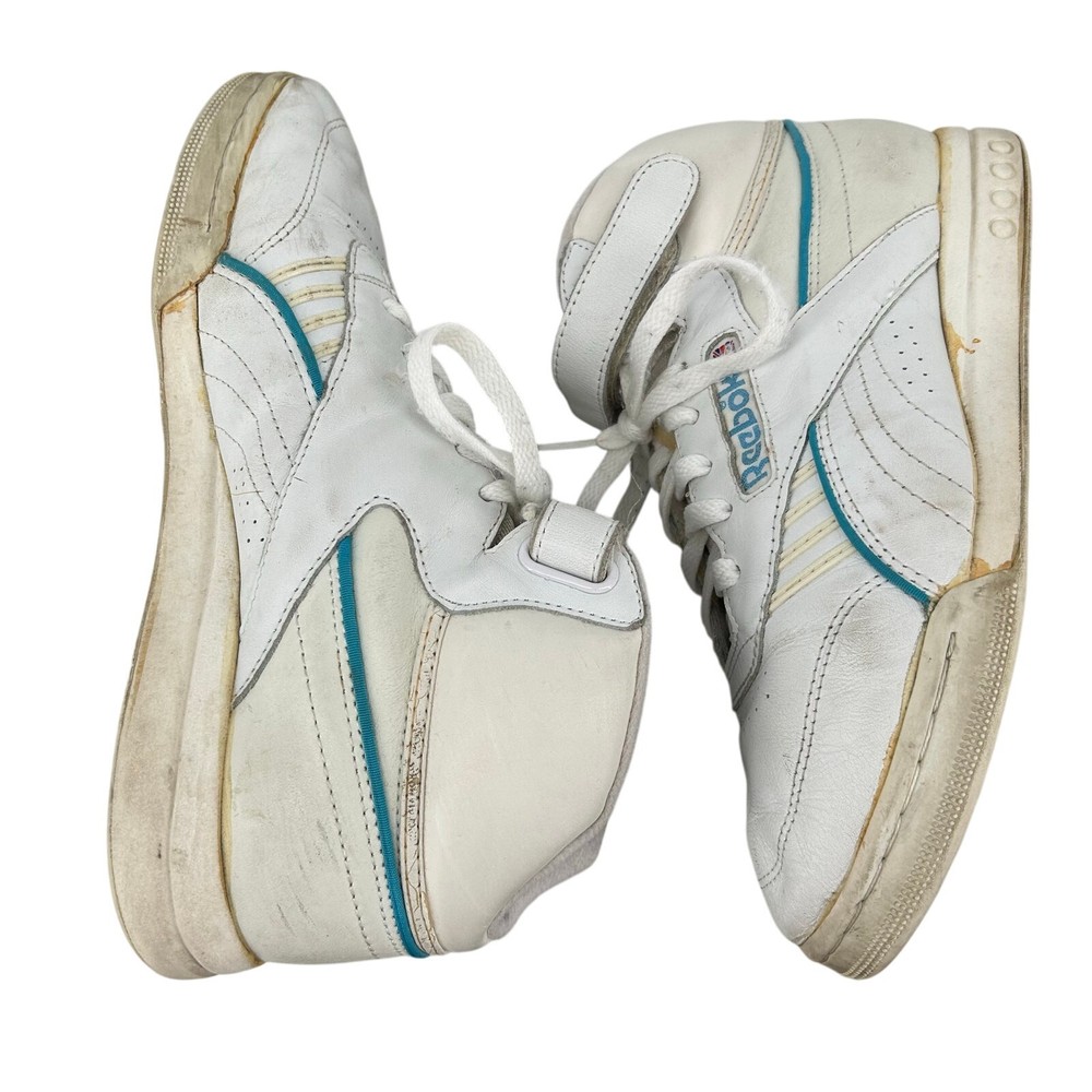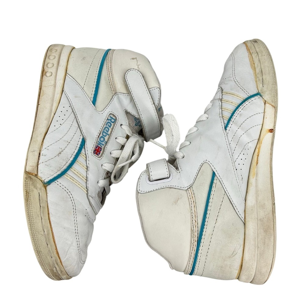 Vintage 80s Retro Women's White Blue Reebok High Top Aerobic 4100 ERS Sneaker Shoes Size 9.5 Size: USA men's 9.5 In fair condition. These are almost 40 years old, so there is staining, creasing, yellowing, etc. Please see photos. Cross listed on several platforms. Feel free to ask any questions!