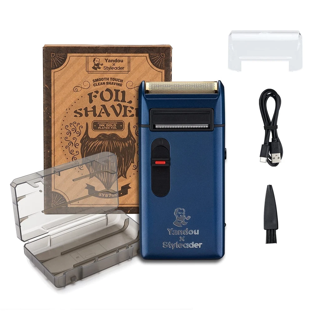Retro Electric Razor for Men, Rechargeable Mens Gold Foil Shavers,Travel Electric Shavers for Men(Blue) Product Details Color: Blue Brand: Styleader MPN: SY8700-B UPC: Does not apply EAN: Does not apply Brand: Styleader Recommended Uses For Product: Beard Special Feature: Portable Power Source: Corded Electric Included Components: Cleaning Brush, Protective Cap, Charger Product Dimensions : 5.91 x 3.94 x 1.97 inches; 7.05 ounces Item model number : SY8700-B Date First Available : October 15, 2021 Manufacturer : Styleader Professional Electric Shaver: Razor with gold-plated aluminum foil blades, 0.05 mm mesh thickness, large blade mesh design, wide shaving surface, strong power, can improve shaving efficiency and bring you a better shaving experience. Hair Trimmer For Men: The side of the razor can pop up the trimmer, which can quickly and easily trim the thick hair on the face, neck and chin, keeping the head and face clean and tidy without pulling the hair and scratching sensitive skin. Thoughtful Design: Removable head protector to prevent the razor foil head from breaking; razor case comes with a brush that can be placed inside, so you never have to worry about finding a brush again. Convenient Travel: It can run for 50 minutes after a full charge and comes with a USB charging cable, the front and back of the aluminum foil shaver is a metal case, hold a very textured, stylish and compact, ideal for travel. Ideal Gift: Razors are an indispensable item in daily life of men. The Styleader electric shaver body is retro and stylish, and with its elegant packaging design,Perfect as birthday, holiday and other festive gifts for husbands, fathers, sons and boyfriends.