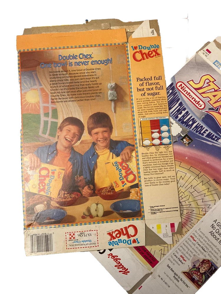 These 4 retro flattened cereal boxes are true timepieces, stamped with history. They’re not just dated cereal boxes—they feature advertising that reflects the events and pop culture of the time, like the Olympics and Nintendo. These boxes were part of the cereal we actually ate and saved, making them even more special. While they are in excellent condition, please note they are older and may show some signs of wear due to age. A rare and collectible set that captures the essence of the past!