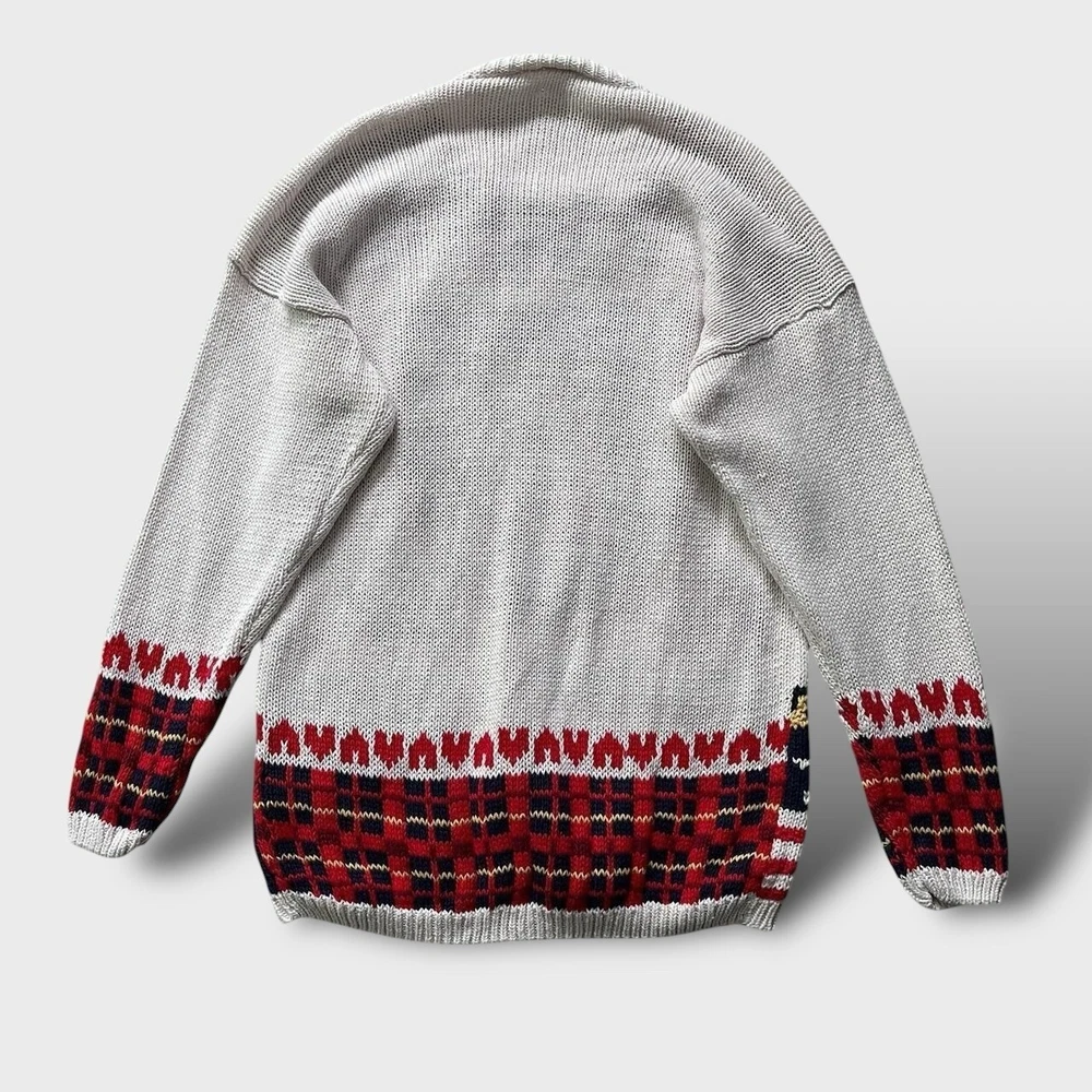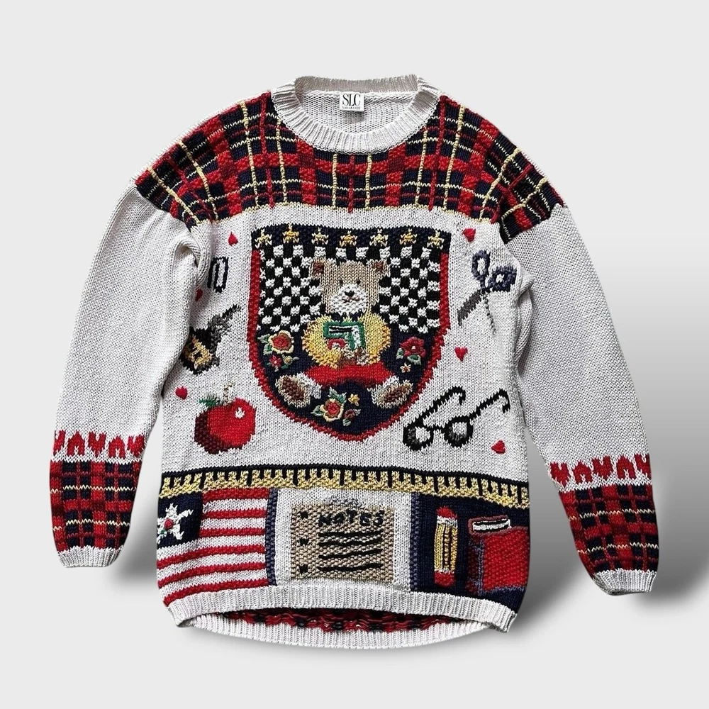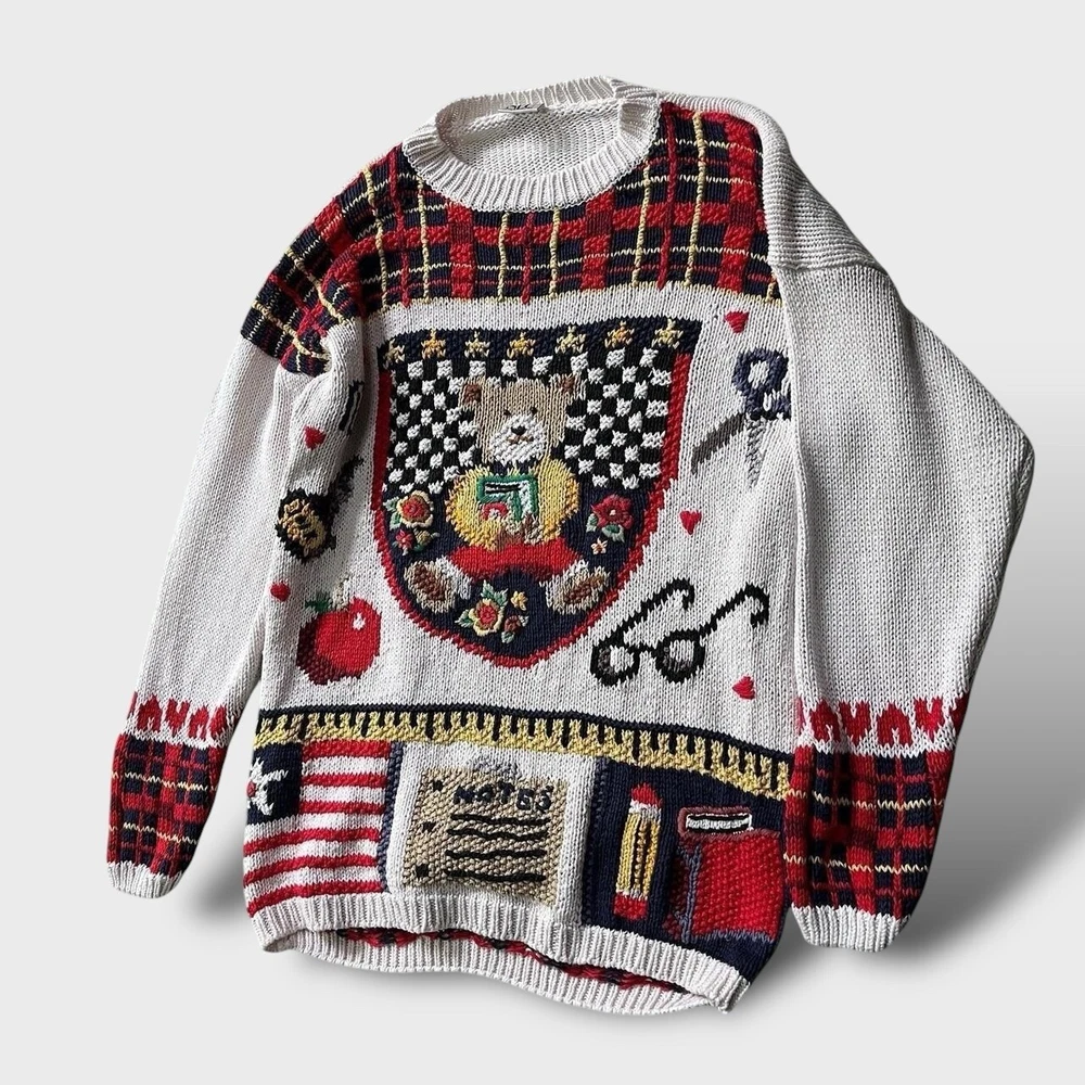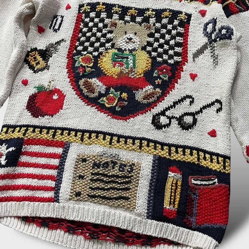 Vintage knitted jumper | unique designer | Sur La Cote 💡 good condition- normal wash wear, no faults, there is a name written on the back on inside labels 💡 from Los Angeles based women owned designer brand Sur La Cote 💡 55% ramie 45% cotton 💡 incredible knit work including a teddy bear, scissors, eyeglasses, an apple, ink and notes and more 📐 label 'Free Size' best fits M-L, depending on styling, p2p 20" l27"