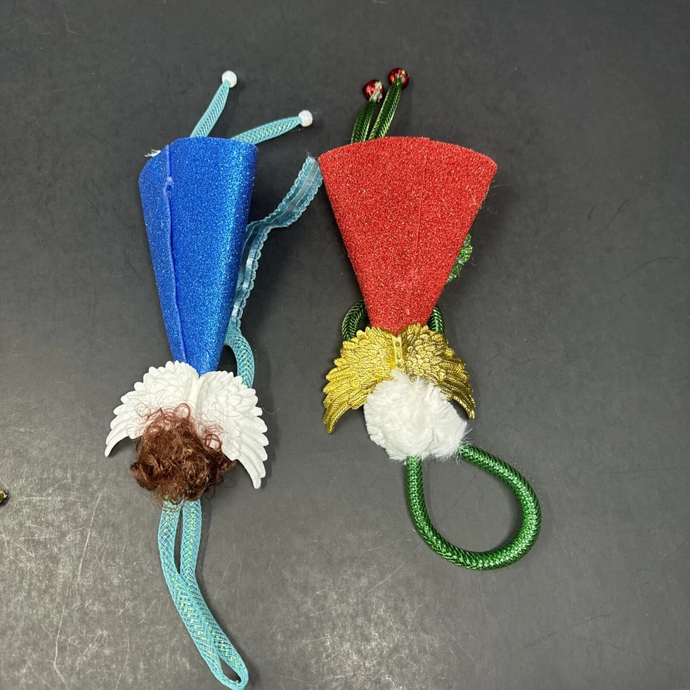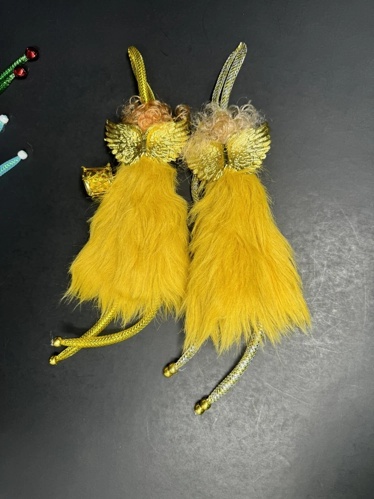 Add some retro charm to your Christmas tree with this lot of four vintage angel ornaments. These handmade ornaments feature faux fur piping, glitter, wood, cloth, and fabric materials that give them a unique and kitschy look. Each ornament is solidly patterned and shaped as an angel, perfect for any angel-themed Christmas decor. The set includes four hanging ornaments that are sure to add some sparkle and personality to your tree. These angel ornaments are measuring approximately 12 inches in height.