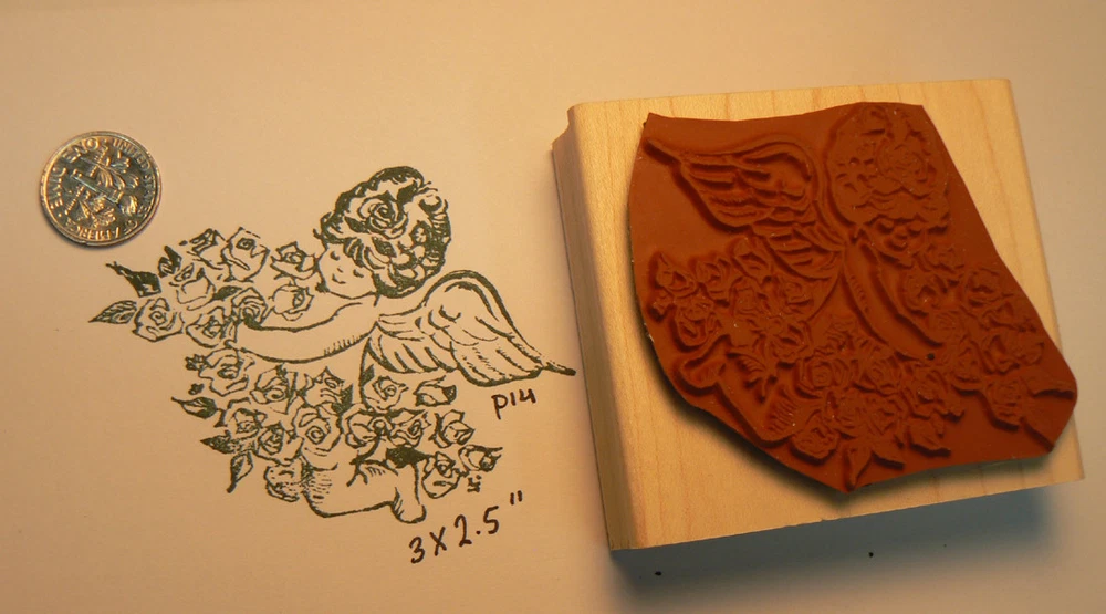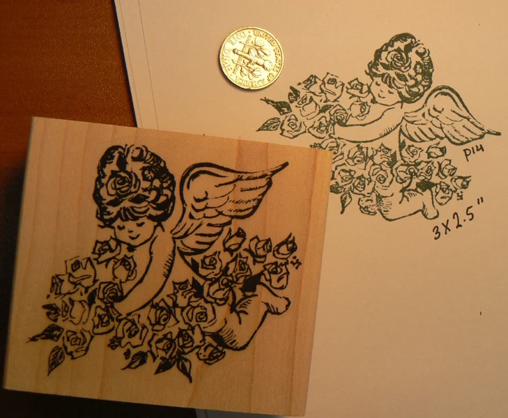 Angel with flowers (roses) Rubber Stamp. Deep etched Measures 3x2.5" and comes mounted onto maple wood. Thanks, Syl Have fun stamping.