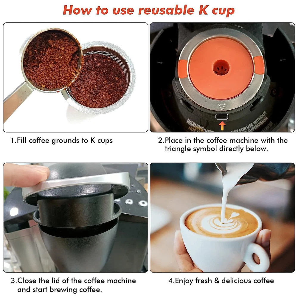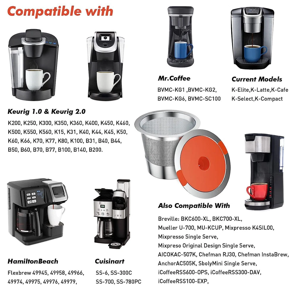 Compatibility for Keurig 2.0 and 1.0:K200, K250, K300, K350, K360, K400, K450, K460, K500, K550, K560, K15, K31, K40, K44, K45, K50, K60, K66, K70, K77, K80, K100, B31, B40, B44, B50, B60, B66, B70, B77, B100, B140, B200 As Well As The Following Brewers:Keurig Elite, Keurig Select,Keurig Ultimate,and The Keurig Platinum.Breville K CUP,Mr. Coffee K CUP. But NOT Compatible with: Keurig mini,Keurig duo,Keurig K-Supreme, K-Supreme Plus, Keurig K-Supreme Smart These stainless steel refillable cups for Keurig coffee makers allow you to save up to 80% over pre-filled single cup coffee capsules and avoid wasting non-recyclable K-cups. You can buy a bag of coffee, fill it yourself using these reusable coffee filters, and enjoy your favorite coffee drink High Quality:These Keurig K cups are made of high quality Non-BPA food grade stainless steel mesh material, 360° mesh plus mesh at the bottom to ensure even water flow, stainless steel microporous filter allows the natural oils in the coffee beans to pass through the fine mesh for better taste and no plastic taste thus getting the purest coffee Reliable Sealing: Reusable k cups are designed with a one-piece construction and a solid top seal. The product has undergone multiple tests to ensure there is no leakage Easy to Use & Clean:Reusable K CUP are very easy to use, just fill the coffee grounds you need into the reusable K CUP, after using, just dump the grounds into the trash and wash the reusable K CUP filter by water. Also these refillable single K CUP are safe for dishwasher