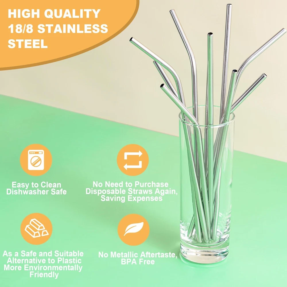 Reusable Stainless Steel Straws -16 Pack 10.5" & 8.5" 16 Piece Set, Silver Product Details Material: Stainless Steel Color: Silver Size: 16 Piece Set Special Feature: Reusable Brand: Hoewina Unit Count: 16.0 Count Number of Items: 16 Manufacturer: Hoewina Product Dimensions: 11.3 x 3.4 x 0.7 inches Item Weight: 6.9 ounces Country of Origin: China Item model number: XG-16-Silver 18/8 Food Grade Stainless Steel: Our reusable metal straws are made of high-quality stainless steel, ensuring durability and longevity. Say goodbye to flimsy plastic straws! Safe and Hygienic: The set includes 4 PCS straw cleaner brush extra long, perfect for the length of the metal straw. The stainless steel construction of these reusable straw makes them easy to clean. Enjoy your drinks worry-free! Eco-Friendly Choice: A stainless steel straw can be used for several years, replacing hundreds of plastic straws. By choosing our straws reusable stainless steel, you contribute to reducing plastic waste and protecting the environment. Make a positive impact with every sip! Versatile and Practical: Our smoothie straws with silicone tip 16PCS, BPA-Free. And the surface of the steel straws drinking reusable is well polished, very smooth, and they will not accidentally cut your lips or gums. Making them perfect for beverages, lemonade, juice, cocktail, coffee, ice tea, cappuccino - hot or cold. Also suitable for family party, hiking, office, trips and outdoor picnics use. Sip comfortably and stylishly! Convenient and Portable: These stainless steel straws are long enough to fit most cups, glasses, and bottles. 10.5 "4 straight drinking straws and 4 bent straws for 40 oz tumbler. 8.5 "4 straight straws and 4 bent straws suitable for 20oz cups. They come with a compact carrying case, ideal for travel and on-the-go use.