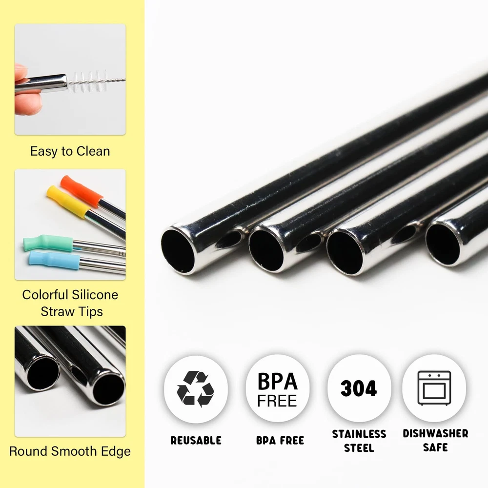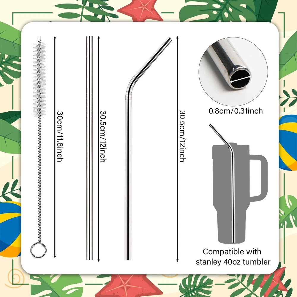 Compatible Set: This straw replacement kit for Stanley 40 oz tumbler includes 2 straight straws, 2 curved straws, 4 silicone straw tips and 1 cleaning brush. The extra long metal straw measures 12 inches (305mm) in length and 0.31 inches (8mm) in diameter. Our reusable straw replacement fits easily in your 40 oz stanley cup and simple modern tumbler, also is compatible with most popular brands. ECO-friendly Material: Our eco-friendly stainless steel straw set for Stanley tumber with handle is made with premium quality 18/8 food grade quality stainless steel that is non-toxic, BPA free, rust free, lead free, scratch proof and most importantly without any metal aftertaste. You can help save the planet by replacing the plastic straws with our stainless steel straws. High Quality Polishing : With our unique polishing technique, the surface of our extra long sainless steel straws replacement are well polished. It is easier to get the silicone tips on/off of the metal straws. The design of the straw head is very safe, its edges are rounded concave and smooth on every tip. Awesome Accessories:Silicone tips help protect your lips from burning/freezing with hot/cold beverages. Available in four different silicone top colors to serve as your family's identifier. 1 FREE extra long 12 '' cleaning brush is the perfect size for these compatible Stanley cup straws. With this nylon brush, you can clean straws more easily without worrying about damaging them. You can also easily hang the brush by the ring at the end. Wide application: Metal straws with silicone tips fit perfectly in a 40 oz Stanley Quencher tumbler, perfect for light smoothies, water, soda, coffee, tea, energy drinks, milk, beer and any other liquid beverages. This reusable stainless steel straws set makes a thoughtful gift for those who enjoy drinking & care about the environment. Great gift choice for your families and friends who have a 40oz Adventure Quencher Travel Tumbler.