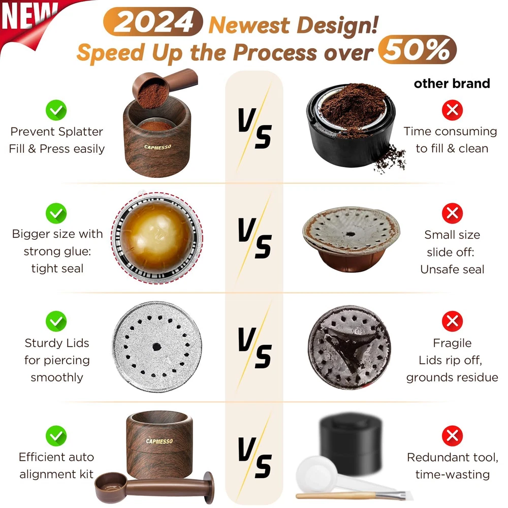 Reusable Vertuo Pod Refill Kit for Nespresso: Reusable Vertuo Capsule for Nespresso/Coffee Pods Vertuoline with 100 Aluminum Foil Lids for Any Size of Vertuo Plus Espresso Pod- Wood Grain Holder ☕Ultimate Refill Kit for Reusable Nespresso Vertuo Pods: Experience unparalleled convenience with our all-in-one Nespresso pods vertuo refill kit, including 100 sturdy aluminum foil seals, a dual-ended brush for easy filling, and a seamless filling base. This innovative vertuo pod kit enhances refill efficiency by over 50%, saving you time, money, and reducing waste. Also, the plastic base paired with walnut wood grain adds elegance to your coffee bar (Pods not included) ☕Perfect Fit for All Vertuo Pods: Designed for compatibility with all size Nespresso Vertuo refillable pods (excluding bottom vertuo capsules) on all VertuoLine machine,including Vertuo,VertuoPlus, Vertuo Next and Vertuo Pop. Our nespresso accessories kit allows you to create reusable vertuo pods for nespresso in just 15 seconds, simplifying your coffee-making routine ☕The Newest Foil Lids for Maximum Freshness: Our upgraded aluminum lids covers are expertly embossed for strength, preventing tearing and leakage as others while ensuring an airtight seal. No mess and no harm to your expensive machine. Enjoy fresh, full-bodied espresso with a rich crema every time ☕Smart & Effortless Brewing Solution: Refilling your Nespresso refillable pods has never been easier. Just fill, seal, and press! Our vertuo refill kit prevents mess and ensures precise alignment of foil seals, without obstructing barcode recognition for optimal flavor extraction ☕Game-Changer for Coffee Lovers: Say goodbye to expensive single-use coffee capsules and hello to endless coffee possibilities! Reusing your nespreso vertuo pods not only saves you money but also helps the planet. With our vertuo pod refill kit, enjoy custom coffee flavors and make every cup special Shipping We offer FREE shipping on all orders! We ship within Three business days of payment, usually sooner. We use a selection of shipping services such as UPS, FedEx, USPS etc. We only ship to the lower 48 states, no APO/FPO addresses or PO Boxes allowed. Local pickups and combined shipping options are not provided at this time. Return You can return a product for up to 30 days from the date you purchased it ONLY if it's in the original condition. The product cannot be used or open. Any product you return must be in the exact same condition you received it and in the original packaging. Please keep the receipt. Feedback Customer satisfaction is very important to us. If you have any problem with your order, please contact us and we will do our best to make you satisfied. Contact Us If you have any queries, please contact us via ebay. We usually respond within 24 hours on weekdays. Please visit our eBay store to check out other items for sale! Thank you for shopping at our store.