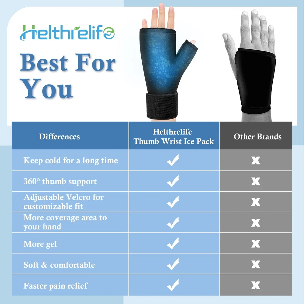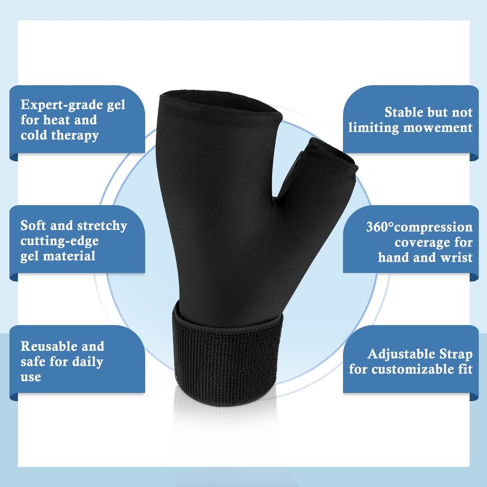 Wearable Thumb Wrist Ice Pack, Gel Hand Ice Glove, Hot Cold Therapy, Adjustable Strap for Pain Relief of Carpal Tunnel, Arthritis, Bruises & Swelling 🎆CUTTING-EDGE GEL MATERIAL: The hand ice pack is made of non-scented soft solid expert-grade gel, retaining flexible after frozen even at 0°F (-18℃). Double-stitched seam on the Lycra fabric prevents the gel from leaking out. Durable and reusable. 🎆360° COVERAGE TO YOUR HAND: The thumb ice pack can provide 360° compression coverage to relieve the pain of your hand, wrist and thumb, fit for both left&right hands. You can adjust the Velcro strap for optimal comfort. 🎆HOT&COLD THERAPY: The gel wrist ice pack can be used for both ice and heat therapy based on your needs. Place the ice glove in the freezer or the microwave to get the cold&heat compression of 15-20mins. You can always keep it in freezer for ready cold use. 🎆MULTIPLE AND EASY TO USE: The thumb and wrist ice pack wrap is uniquely shaped to contour to the wrist and hand, effective for carpal tunnel pain, tfcc pain, rheumatoid arthritis, tendinitis, de quervain's tenosynovitis, inflammation, cramps and swelling. You can wear it while texting, cooking, writing, typing and etc. 🎆EXCELLENT CUSTOMER SERVICE: All products are made of high-quality material. If you are unsatisfied with the hand wrist strap ice pack, please feel free to contact us for 1-year FREE replacement or refund.