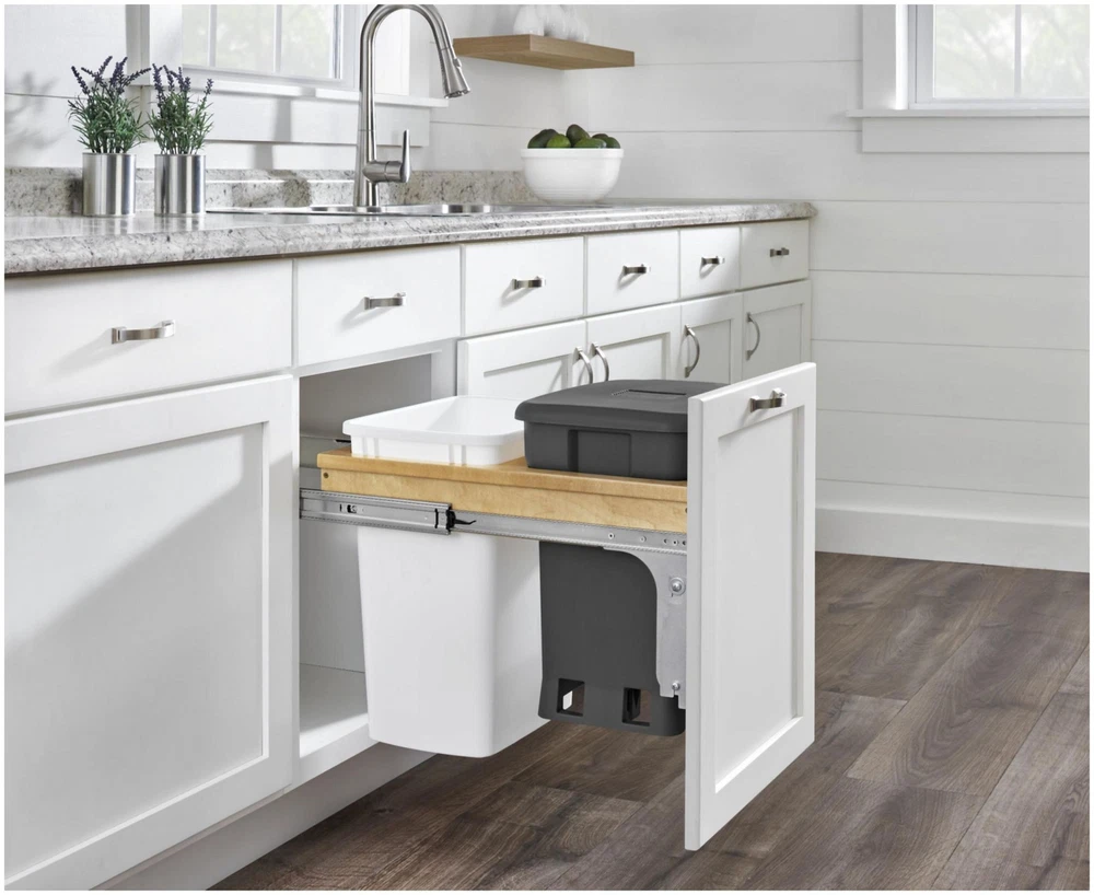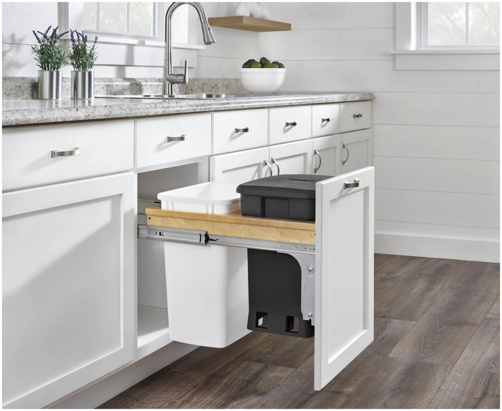 Powered by Frooition All Categories Rev-A-Shelf 4WCTM-18CKSCDM2 Wood Classics 15"W Top Mount Pull Out Combo 35 Qt / 8.75 Gallon Trash Can and Compost Bin System Overview Item Description It stinks when odors from your waste containers take over your home, so solve the problem with Rev-A-Shelf's 4WCTM-CK series top-mount waste container! Featuring Rev-a-Shelf's Compo+, a self-contained odor-reducing waste bin, the unique clamping design keeps odors from diapers, cat litter, trash, and compostable materials out of your household. Features: 3-piece zinc plated heavy duty full extension ball-bearing slide system For proper performance, installation requires proper alignment Comes with (1) roll of compost bags and (1) replaceable carbon filter for compost bin Top-mount waste containers come in many different widths as they are specific to a cabinet opening to function properly Designed for only a cabinet opening width of 15" Adjustable door mount brackets are included and required for operation Optional Rev-A-Shelf lids available, sold separately Fully assembled maple wood construction for durability 150 lb full-extension ball-bearing slides Covered by Rev-A-Shelf's limited lifetime warranty Specifications: Depth: 22-7/8" Height: 19-13/16" Width: 15" Minimum Opening Width: 15" Minimum Opening Height: 21" Includes: One (1) green compost bin and lid One (1) 35 quart waste container One (1) wood frame One (1) pair of slides One (1) roll of compost bags One (1) replaceable carbon filter Door mount brackets Mounting hardware Why Choose BuildInc? OUR PROMISE TO YOU About Us At Build, we promise to provide the best selection we can, most competitive pricing, and unmatched customer service. Our store has quality home improvement products from trusted manufacturers like Moen, American Standard, Delta, Kraus, Kichler, Progress Lighting, Schlage, Kwikset, Baldwin, Broan, NuTone, Air King, and Rev-A-Shelf. With over 200,000 home improvement products for you to choose from, we have just what you need to get your project done. Fast & Free Shipping We promise to make it our priority to get you your items as fast as we can. We ship from 440 warehouses around the country, ensuring that your product will get to you as soon as possible. We know you're eager to get your hands on your new purchase, we would be too. As a bonus, most items ship for free. Returns We are happy to accept returns of unused or defective items for a refund within 30 days from the date of delivery. For returns outside 30 days, please contact our Customer Service team to go over our options. For full details, please view the Shipping and Payments tab above. To initiate a return simply go to the eBay Returns Portal and submit a return request. We ask that all items be returned with all original components via a traceable method. Once your return is received and processed, we will quickly get your refund or replacement issued. If for any reason you are unsatisfied with your purchase or for product or warranty questions, please contact Customer Service team for assistance. More Items! View more great items! About Us | Shipping | Returns | Contact Us | FAQ | Collections | Special Offers! Powered by Frooition Frooition Frooition | No-js Template | eBay design, eBay store design, eBay shop design, eBay template design, eBay listing design (ver:froo_no_js) This listing is currently undergoing maintenance, we apologize for any inconvenience caused.