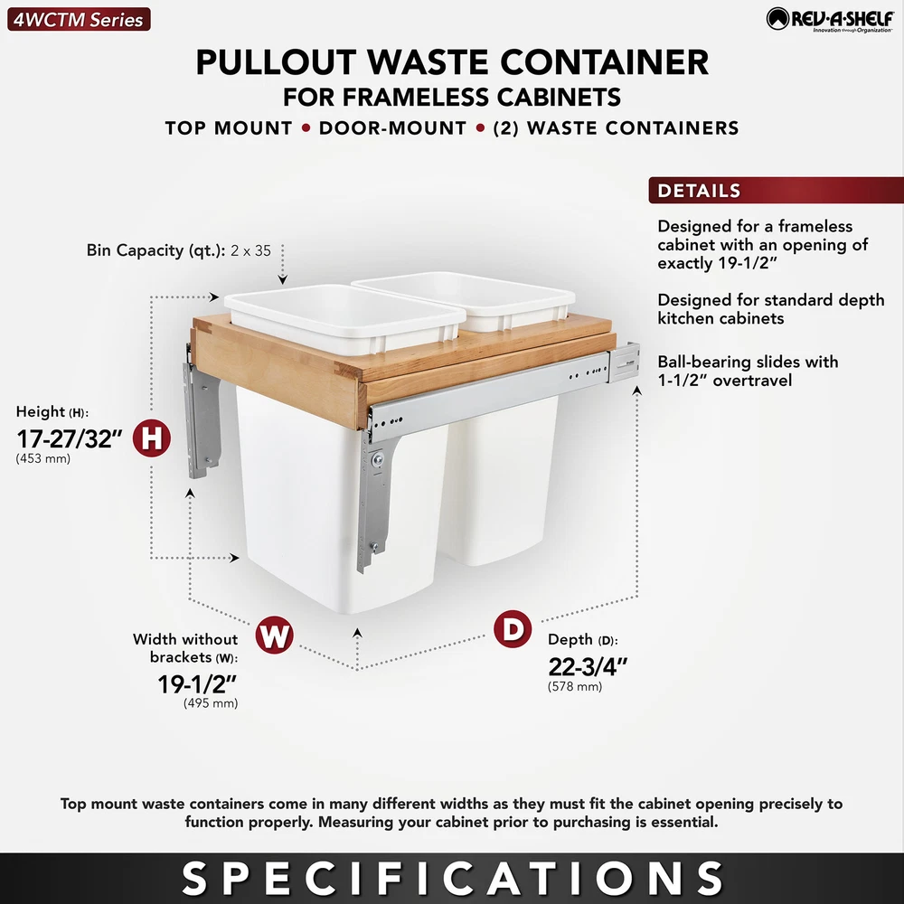 Powered by Frooition All Categories Rev-A-Shelf 4WCTM-21DM2-495-FL Wood Classics 19-1/2"W Top Mount Pull Out Double 35 Qt / 8.75 Gallon Trash Can System Overview Item Description Only one pull out trash container series has stood the test of time, and that is Rev-A-Shelf's top mount series waste containers. The top mount series features a beautiful, fully assembled dovetail wood construction, and full extension slides for total access and easy removal of your trash bins. All of the top mount series also include a 4-way adjustable door mount bracket that will finish off your installation by attaching your own cabinet door for easy operation. Available in various widths, depths and heights for your specific cabinet application. Features: 3-piece zinc plated heavy duty full extension ball-bearing slide system For proper performance, installation requires proper alignment Once installed, unit can be removed for easy cleaning Top-mount waste containers come in many different widths as they are specific to a cabinet opening to function properly Designed for only a cabinet opening width of 19-1/2" Adjustable door mount brackets are included and required for operation Optional Rev-A-Shelf lids available, sold separately Fully assembled maple wood construction for durability 150 lb full-extension ball-bearing slides Covered by Rev-A-Shelf's limited lifetime warranty Specifications: Depth: 22-1/8" Height: 17-7/8" Width: 19-1/2" Minimum Opening Width: 19-1/2" Minimum Opening Height: 18-3/8" Includes: Two (2) 35 quart waste containers One (1) wood frame for frameless cabinets One (1) pair of slides Door mount brackets Mounting hardware Why Choose BuildInc? OUR PROMISE TO YOU About Us At Build, we promise to provide the best selection we can, most competitive pricing, and unmatched customer service. Our store has quality home improvement products from trusted manufacturers like Moen, American Standard, Delta, Kraus, Kichler, Progress Lighting, Schlage, Kwikset, Baldwin, Broan, NuTone, Air King, and Rev-A-Shelf. With over 200,000 home improvement products for you to choose from, we have just what you need to get your project done. Fast & Free Shipping We promise to make it our priority to get you your items as fast as we can. We ship from 440 warehouses around the country, ensuring that your product will get to you as soon as possible. We know you're eager to get your hands on your new purchase, we would be too. As a bonus, most items ship for free. Returns We are happy to accept returns of unused or defective items for a refund within 30 days from the date of delivery. For returns outside 30 days, please contact our Customer Service team to go over our options. For full details, please view the Shipping and Payments tab above. To initiate a return simply go to the eBay Returns Portal and submit a return request. We ask that all items be returned with all original components via a traceable method. Once your return is received and processed, we will quickly get your refund or replacement issued. If for any reason you are unsatisfied with your purchase or for product or warranty questions, please contact Customer Service team for assistance. More Items! View more great items! About Us | Shipping | Returns | Contact Us | FAQ | Collections | Special Offers! Powered by Frooition Frooition Frooition | No-js Template | eBay design, eBay store design, eBay shop design, eBay template design, eBay listing design (ver:froo_no_js) This listing is currently undergoing maintenance, we apologize for any inconvenience caused.