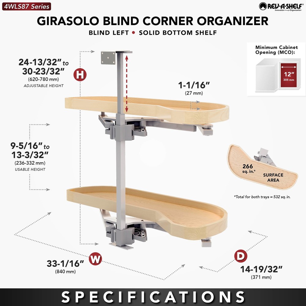 Powered by Frooition Top Products Kitchen Bathroom Lighting Fans Hardware Decor & Organization Rev-A-Shelf 4WLS87-12-R Wood Classic 2 Tier 14-1/2"W Girasolo Pivoting Lazy Susan for Right Door / Blind Left Corner Cabinets with 12" Opening Overview Item Description The 4WLS87 Series “Girasolo” Blind Corner Optimizer by Rev-A-Shelf® is the perfect solution for the dark abyss that can be a blind corner cabinet. This innovative design features two pullout trays that easily glide directly out on a soft-close pivot hardware system, eliminating the need for adjacent appliance clearance. The adjustable shelving system also allows for maximum storage capacity, while optimizing the usage of the hard-to-reach storage area. Features: Adjustable shelves Pulls directly forward, eliminating the need for adjacent appliance clearance Mounted telescopic system with a soft close pivot system Designed for a 39" and 42" right door blind left corner cabinet with a 12" opening (see lifestyles) Natural maple 5/8" thick shelf bottom Solid wood 1-5/8" frame with finger joint rim Weight rating: 33lbs per shelf Mounts to cabinet floor, side, or top - depending on application / need Limited lifetime warranty Specifications: Includes (2) Girasolo pivoting wood trays Includes post mechanism and mounting hardware Height: 24.41" Width: 33.05" (front to back) Depth: 14.57" Weight capacity: 66 lbs / 33 per shelf Minimum cabinet opening: 12"W x 22.5"D x 18.5"H Why Choose BuildInc? OUR PROMISE TO YOU About Us At Build, we promise to provide the best selection we can, most competitive pricing, and unmatched customer service. Our store has quality home improvement products from trusted manufacturers like Moen, American Standard, Delta, Kraus, Kichler, Progress Lighting, Schlage, Kwikset, Baldwin, Broan, NuTone, Air King, and Rev-A-Shelf. With over 200,000 home improvement products for you to choose from, we have just what you need to get your project done. Fast & Free Shipping We promise to make it our priority to get you your items as fast as we can. We ship from 440 warehouses around the country, ensuring that your product will get to you as soon as possible. We know you're eager to get your hands on your new purchase, we would be too. As a bonus, most items ship for free. Returns We are happy to accept returns of unused or defective items for a refund within 30 days from the date of delivery. For returns outside 30 days, please contact our Customer Service team to go over our options. For full details, please view the Shipping and Payments tab above. To initiate a return simply go to the eBay Returns Portal and submit a return request. We ask that all items be returned with all original components via a traceable method. Once your return is received and processed, we will quickly get your refund or replacement issued. If for any reason you are unsatisfied with your purchase or for product or warranty questions, please contact Customer Service team for assistance. More Items! View more great items Transolid TRS_MTSB252212-MR2 Meridian 25" Drop In Single Basin - Brushed $409.51 Blum MB-M-550-HD Merivobox "M"H 22 Inch Full Extension Concealed - Matte Silk $64.36 Kingston Brass KS446.HL Metropolitan 1.2 GPM Widespread Bathroom - Nickel $318.47 Kingston Brass KSD354.KL Knight 1.2 GPM 1 Hole Bathroom Faucet - Brass $623.97 About Us | Shipping | Returns | Contact Us | FAQ | Collections | Special Offers! Powered by Frooition Frooition Frooition | No-js Template | eBay design, eBay store design, eBay shop design, eBay template design, eBay listing design (ver:froo_no_js) This listing is currently undergoing maintenance, we apologize for any inconvenience caused.