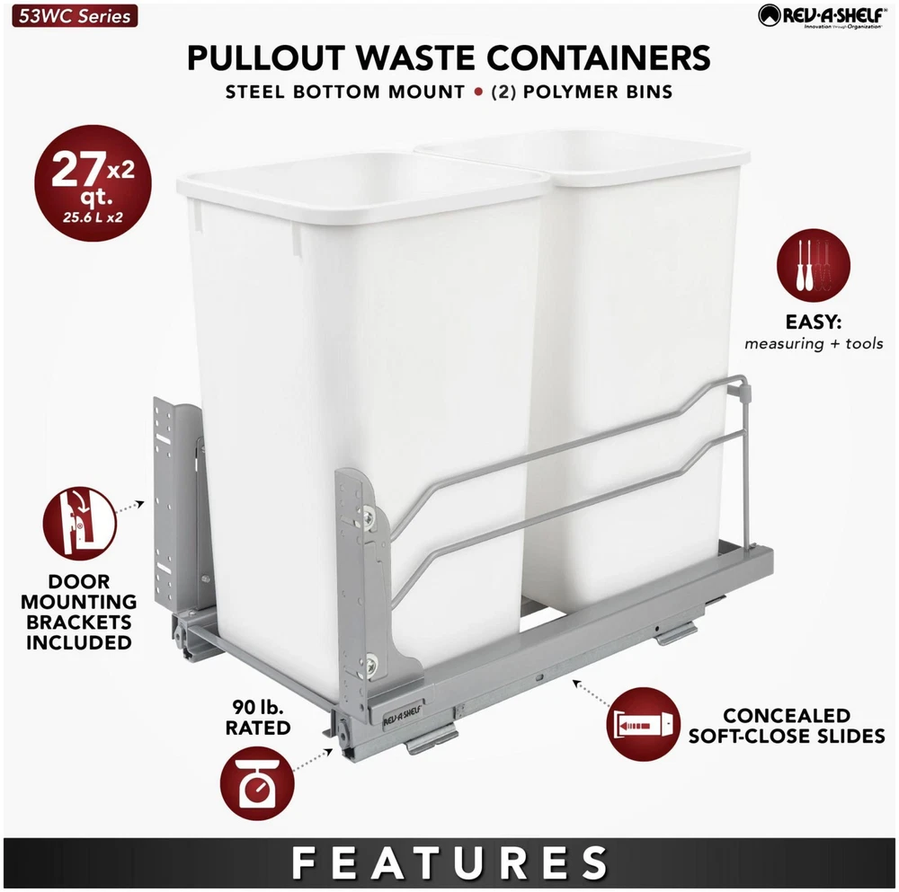 Powered by Frooition All Categories Rev-A-Shelf 53WC-1527SCDM-2 Modern 11"W Steel Bottom Mount Double 27 Qt / 6.75 Gallon Pull Out Trash Can Waste System with Soft Close Slides Overview Item Description Looking to upgrade your existing freestanding trash container and want to get it off the floor and inside of your cabinet? Well, this is the pull out waste container for you! Solid steel construction that features soft-close full extension slides for easy access. All of the 53WC series also includes a 4-way adjustable door mount bracket that will finish off your installation by attaching your own cabinet door for easy operation. Available in various colors, heights and widths. Features: Undermount soft close full extension concealed slide system Door Kit included and door must be attached to operate successfully Waste container bins included Waste container fully extends outside of the cabinet for easy access to the rear bin These units are perfect for large/small families as well as for recycling or sorting trash/waste Designed for cabinet opening width of 11-1/2" to 15" Adjustable door mount brackets are included and required for operation Has a heavy gauge powder coated metal wire construction Mounts to cabinet floor and cabinet door attaches to unit 90 lb full-extension undermount slides with soft close Covered by Rev-A-Shelf's limited lifetime warranty Specifications: Depth: 22-1/16" Height: 18-15/16" Width: 11-1/4" Minimum Opening Width: 11-1/2" Minimum Opening Height: 19-1/4" Includes: Two (2) 27 quart / 6.75 gallon waste containers One (1) metal frame One (1) pair of slides Door mount brackets Mounting hardware Pull Out Trash Cans, Pull Out Waste Bins, Hidden Trash Cans, Cabinet Trash Cans, Rev A Shelf Trash, Pull Out Garbage, Pull Out Trashcan Why Choose BuildInc? OUR PROMISE TO YOU About Us At Build, we promise to provide the best selection we can, most competitive pricing, and unmatched customer service. Our store has quality home improvement products from trusted manufacturers like Moen, American Standard, Delta, Kraus, Kichler, Progress Lighting, Schlage, Kwikset, Baldwin, Broan, NuTone, Air King, and Rev-A-Shelf. With over 200,000 home improvement products for you to choose from, we have just what you need to get your project done. Fast & Free Shipping We promise to make it our priority to get you your items as fast as we can. We ship from 440 warehouses around the country, ensuring that your product will get to you as soon as possible. We know you're eager to get your hands on your new purchase, we would be too. As a bonus, most items ship for free. Returns We are happy to accept returns of unused or defective items for a refund within 30 days from the date of delivery. For returns outside 30 days, please contact our Customer Service team to go over our options. For full details, please view the Shipping and Payments tab above. To initiate a return simply go to the eBay Returns Portal and submit a return request. We ask that all items be returned with all original components via a traceable method. Once your return is received and processed, we will quickly get your refund or replacement issued. If for any reason you are unsatisfied with your purchase or for product or warranty questions, please contact Customer Service team for assistance. More Items! View more great items! About Us | Shipping | Returns | Contact Us | FAQ | Collections | Special Offers! Powered by Frooition Frooition Frooition | No-js Template | eBay design, eBay store design, eBay shop design, eBay template design, eBay listing design (ver:froo_no_js) This listing is currently undergoing maintenance, we apologize for any inconvenience caused.
