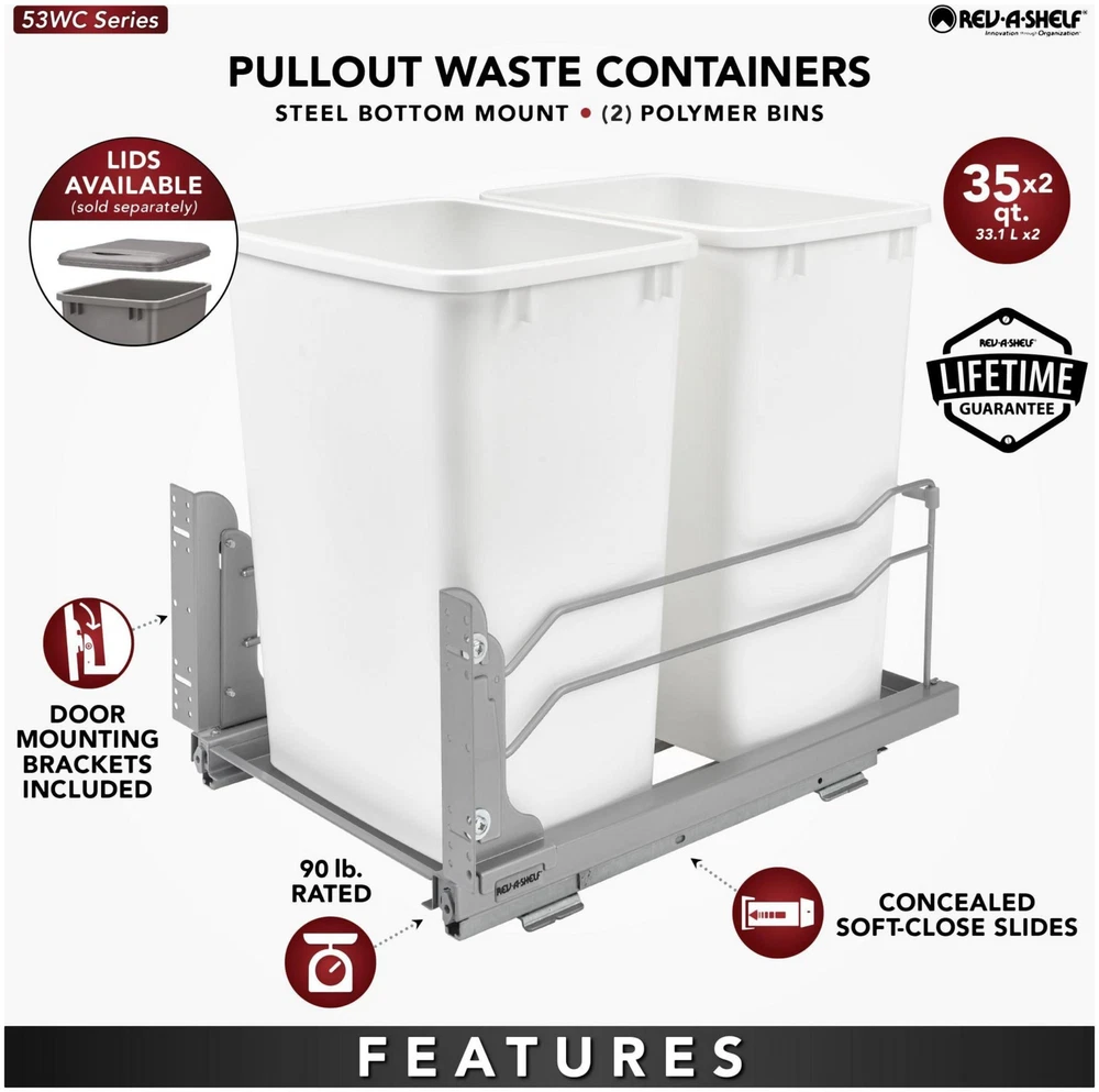 Powered by Frooition All Categories Rev-A-Shelf 53WC-1835SCDM-2 Modern 14-1/2"W Steel Bottom Mount Double 35 Qt / 8.75 Gallon Pull Out Trash Can with Soft Close Slides Overview Item Description Looking to upgrade your existing freestanding trash container and want to get it off the floor and inside of your cabinet? Well, this is the pull out waste container for you! Solid steel construction that features soft-close full extension slides for easy access. All of the 53WC series also includes a 4-way adjustable door mount bracket that will finish off your installation by attaching your own cabinet door for easy operation. Available in various colors, heights and widths. Features: Undermount soft close full extension concealed slide system Door Kit included and door must be attached to operate successfully Waste container bins included Waste container fully extends outside of the cabinet for easy access to the rear bin These units are perfect for large/small families as well as for recycling or sorting trash/waste Designed for cabinet opening width of 14-1/2" to 18" Adjustable door mount brackets are included and required for operation Optional Rev-A-Shelf lids available, sold separately Has a heavy gauge powder coated metal wire construction Mounts to cabinet floor and cabinet door attaches to unit 90 lb full-extension undermount slides with soft close Covered by Rev-A-Shelf's limited lifetime warranty Specifications: Depth: 22-1/4" Height: 19" Width: 14-3/8" Minimum Opening Width: 14-1/2" Minimum Opening Height: 19-1/4" Includes: Two (2) 35 quart / 8.75 gallon waste containers One (1) metal frame One (1) pair of slides Door mount brackets Mounting hardware Pull Out Trash Cans, Pull Out Waste Bins, Hidden Trash Cans, Cabinet Trash Cans, Rev A Shelf Trash, Pull Out Garbage, Pull Out Trashcan Why Choose BuildInc? OUR PROMISE TO YOU About Us At Build, we promise to provide the best selection we can, most competitive pricing, and unmatched customer service. Our store has quality home improvement products from trusted manufacturers like Moen, American Standard, Delta, Kraus, Kichler, Progress Lighting, Schlage, Kwikset, Baldwin, Broan, NuTone, Air King, and Rev-A-Shelf. With over 200,000 home improvement products for you to choose from, we have just what you need to get your project done. Fast & Free Shipping We promise to make it our priority to get you your items as fast as we can. We ship from 440 warehouses around the country, ensuring that your product will get to you as soon as possible. We know you're eager to get your hands on your new purchase, we would be too. As a bonus, most items ship for free. Returns We are happy to accept returns of unused or defective items for a refund within 30 days from the date of delivery. For returns outside 30 days, please contact our Customer Service team to go over our options. For full details, please view the Shipping and Payments tab above. To initiate a return simply go to the eBay Returns Portal and submit a return request. We ask that all items be returned with all original components via a traceable method. Once your return is received and processed, we will quickly get your refund or replacement issued. If for any reason you are unsatisfied with your purchase or for product or warranty questions, please contact Customer Service team for assistance. More Items! View more great items! About Us | Shipping | Returns | Contact Us | FAQ | Collections | Special Offers! Powered by Frooition Frooition Frooition | No-js Template | eBay design, eBay store design, eBay shop design, eBay template design, eBay listing design (ver:froo_no_js) This listing is currently undergoing maintenance, we apologize for any inconvenience caused.