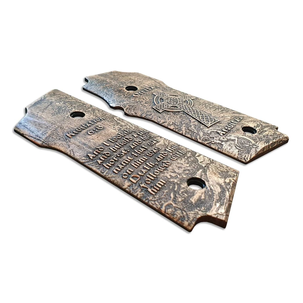 New Smith And Wesson 645 grips with "Revelation 6:8" design. Carved from solid natural wood Note: The original pistol frame has square shaped seating screws. You will have to make small modifications to the round holes in the grips yourself to ensure a successful fit. Since these screws are installed at different angles on each model, this operation falls to you. It's not complicated. You need to trim the inner walls of the grips screw holes just a little bit so that they match the faces of the screws on the frame - Cut by CNC. Sanded, painted and oiled by hand