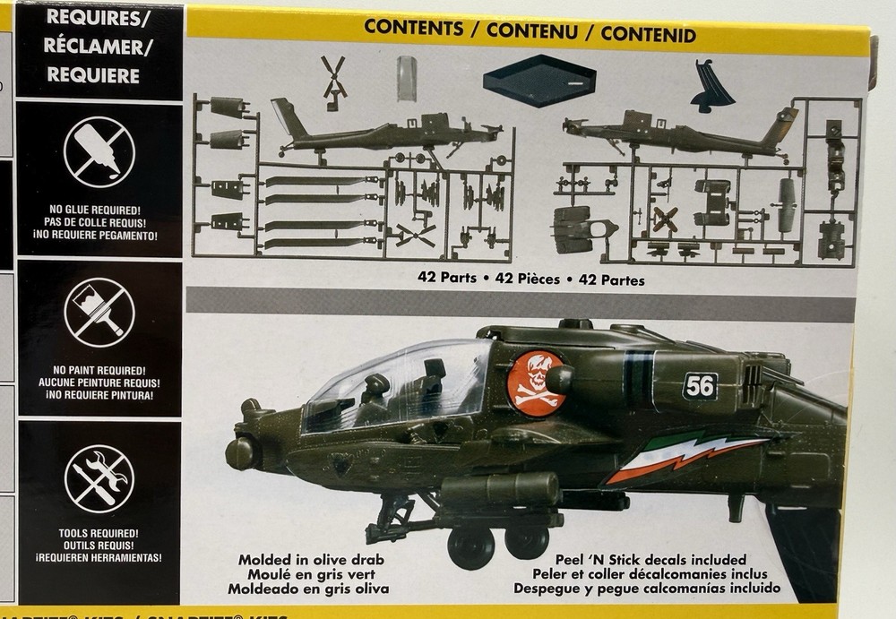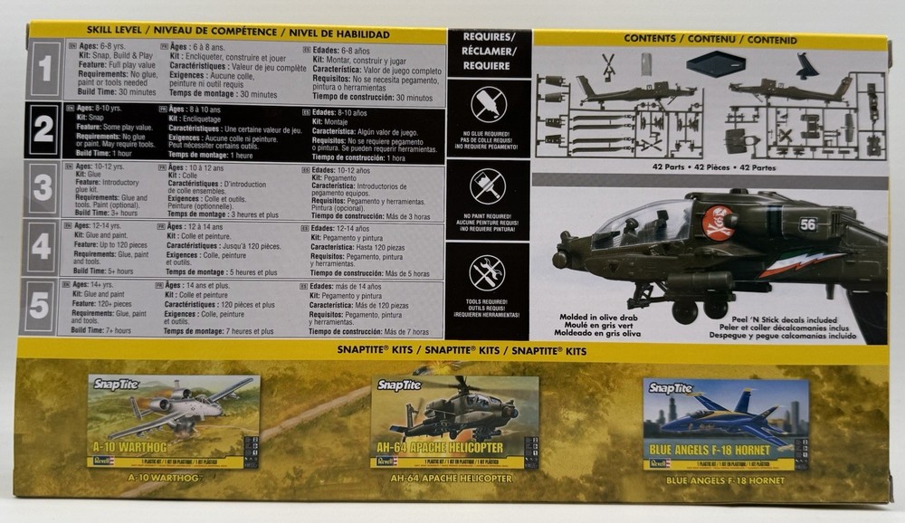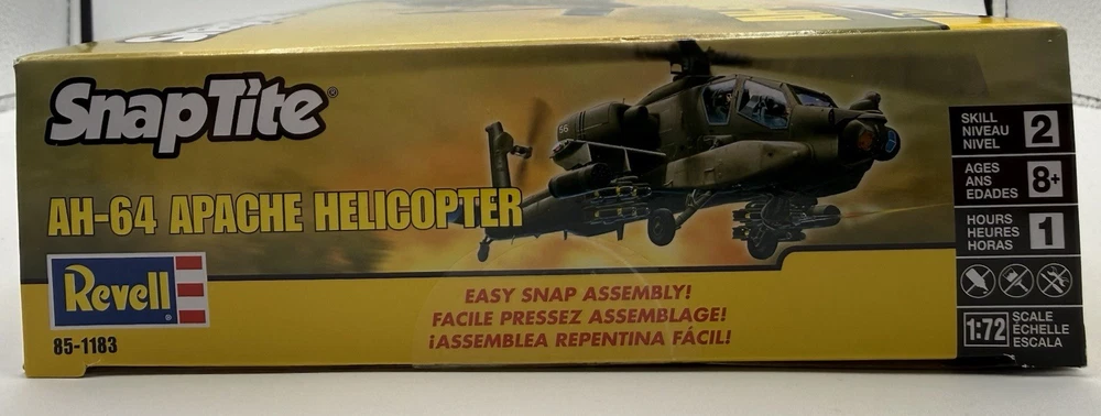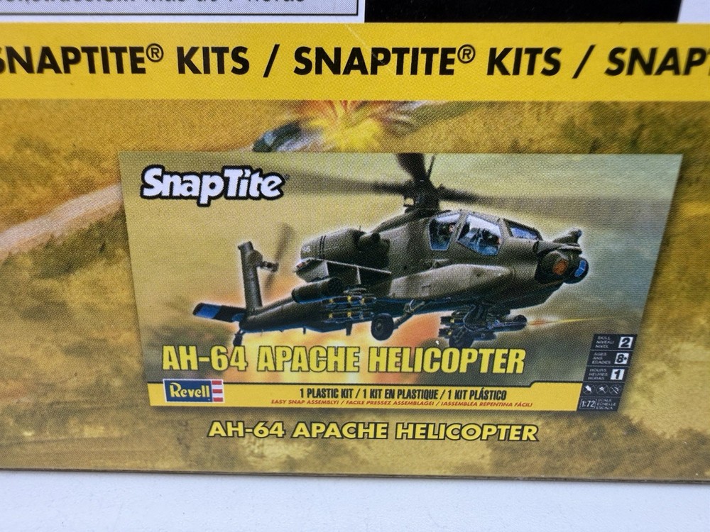 The Revell SnapTite AH-64 Apache Helicopter 1:72 Scale Model Kit is a plastic unassembled kit of a green Apache helicopter. It is brand new and sealed, making it ideal for model enthusiasts aged 8-11 years and older. This model features a skill level of 2 – Easy, perfect for beginners looking to build their first aircraft model. The set includes everything needed to assemble the helicopter, with a height of 2 inches and a weight of 1 pound. With its militaria theme and detailed design, this model is a great addition to any collection.