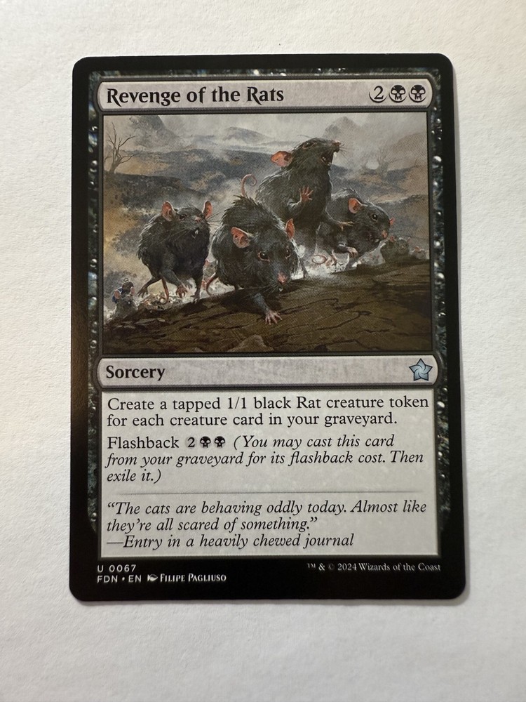 Illustrator:Filipe PagliusoManufacturer:Wizards of the CoastCost:2bbbrand:Wizards of the CoastSet:FoundationsAdditional Description:Revenge of the RatsLanguage:EnglishCard Number:67Finish:RegularGame:Magic: The GatheringCard Name:Revenge of the RatsRarity:UncommonAttribute/MTG:Color:BlackCard Text:Create a tapped 1/1 black Rat creature token for each creature card in your graveyard.