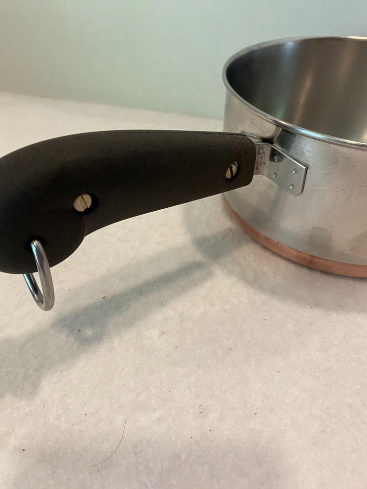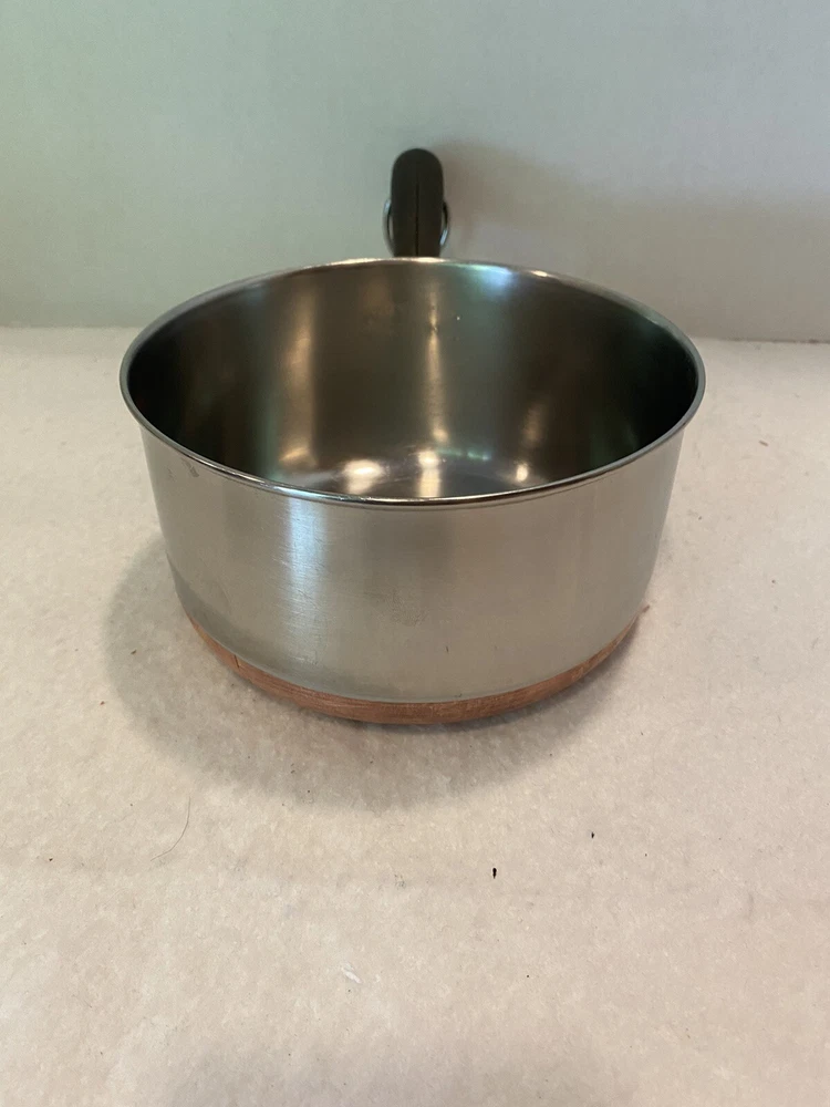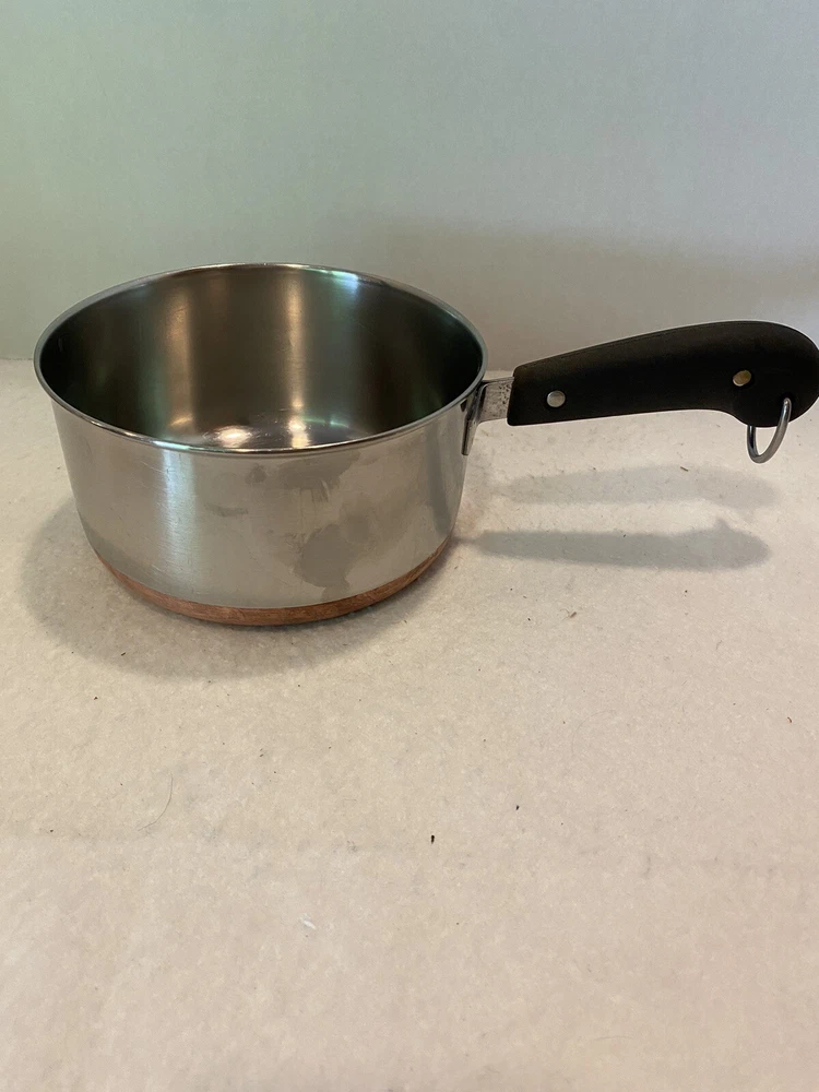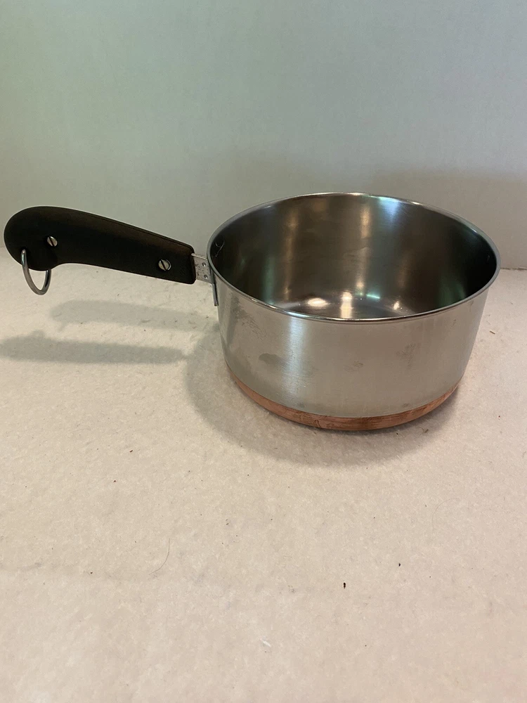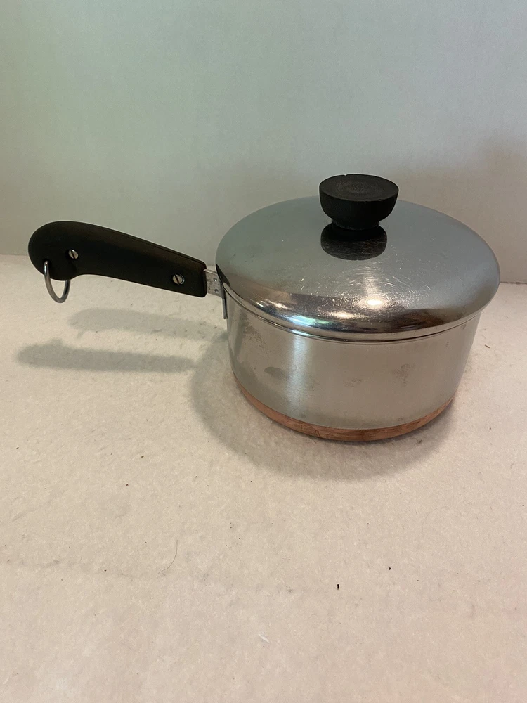 The double ring on the bottom is faint due to age and use, but is there. There are a few dings on the handle of the lid. Please see pictures for full description. Revere Ware 1 1/2 QT Double Circle Pre 1968 Sauce Pan Copper Clad Bottom W/ Lid