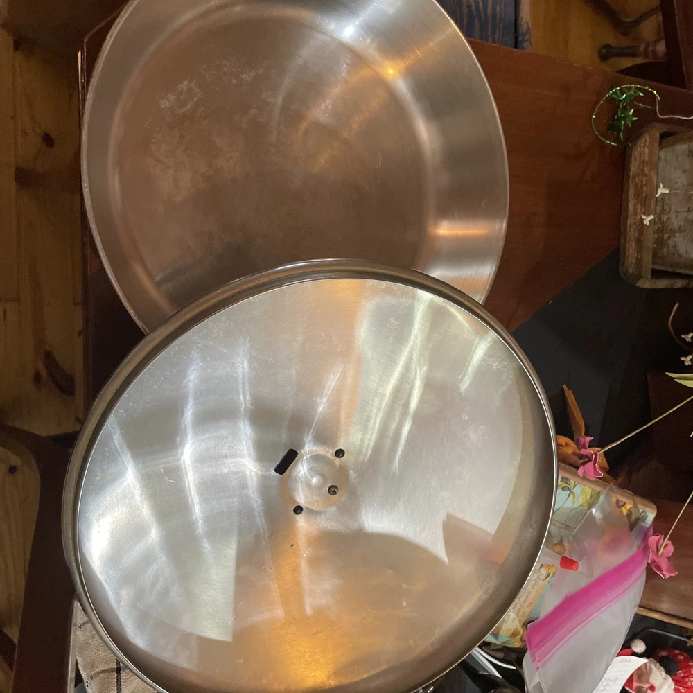 This vintage Revere Ware 12-inch deep fryer skillet with a vented lid is a versatile addition to any kitchen. Made of stainless steel with a tri-ply disc bottom, it is compatible with both electric and gas stoves. The round skillet has a silver color and a height of 2 1/2 inches. Collectors of vintage kitchenware will appreciate that this skillet is made by Revere Ware and features the brand's signature craftsmanship. It is perfect for frying up your favorite foods or for use as a serving platter. Add this unique piece to your collection today!