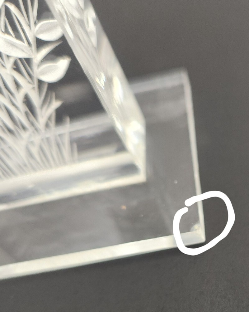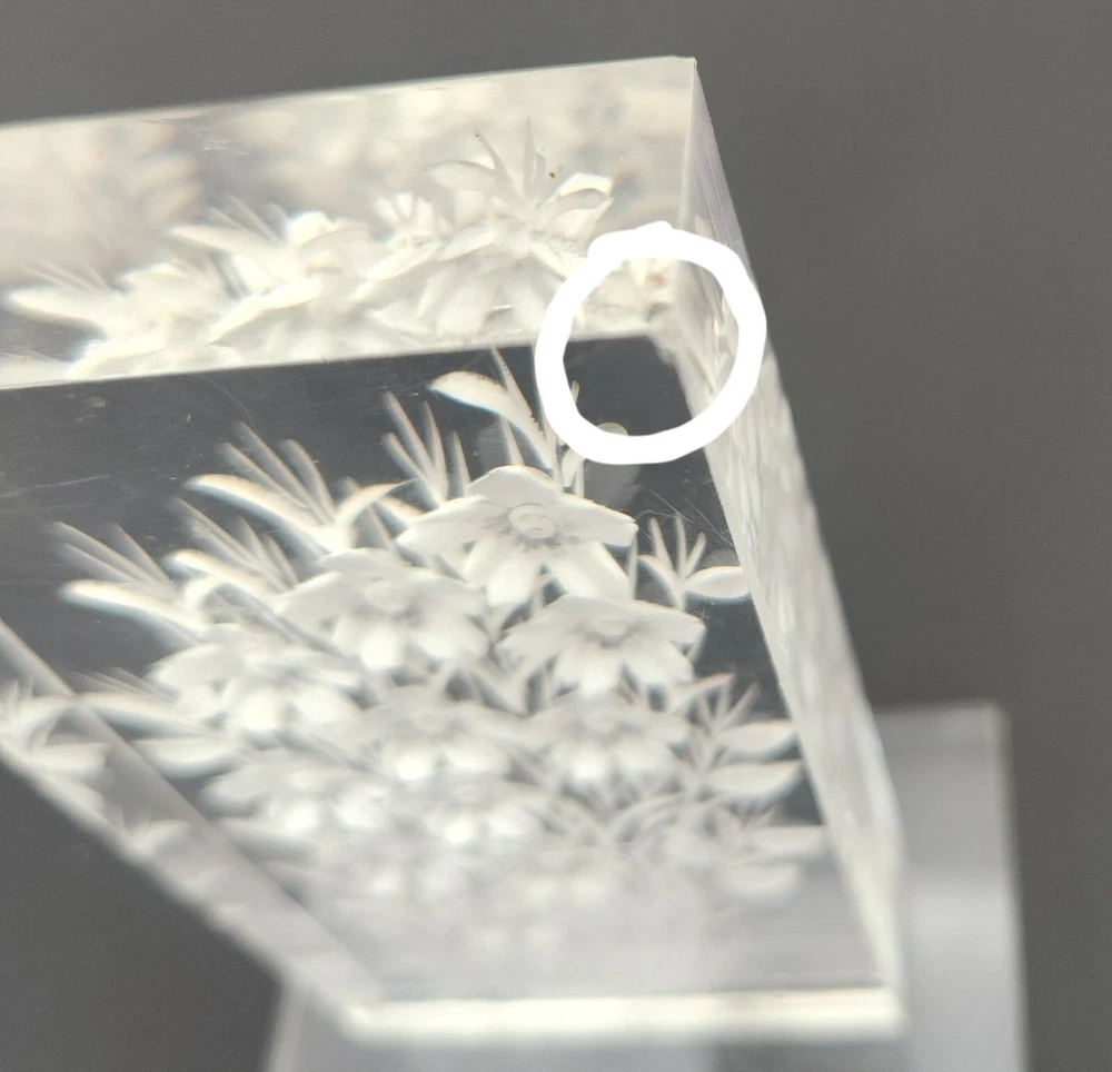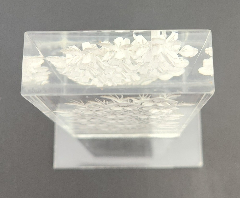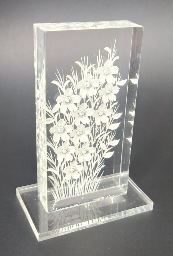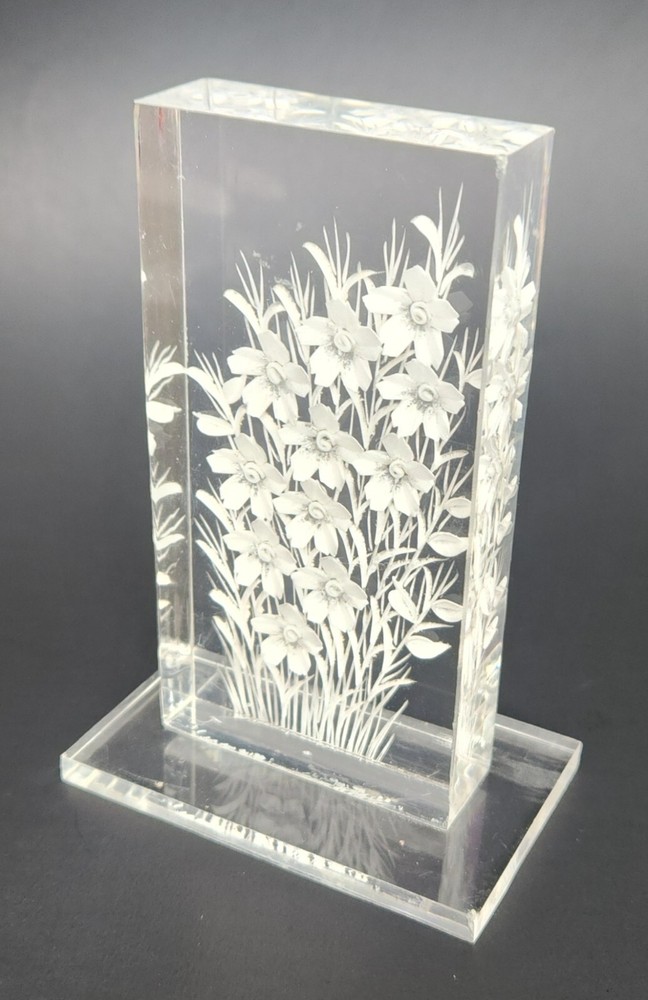 Vintage lucite acrylic reverse carved flowers paperweight. 4 1/8"T x 2.75"W. Two small fleabites. See last two photos. Otherwise in great condition.