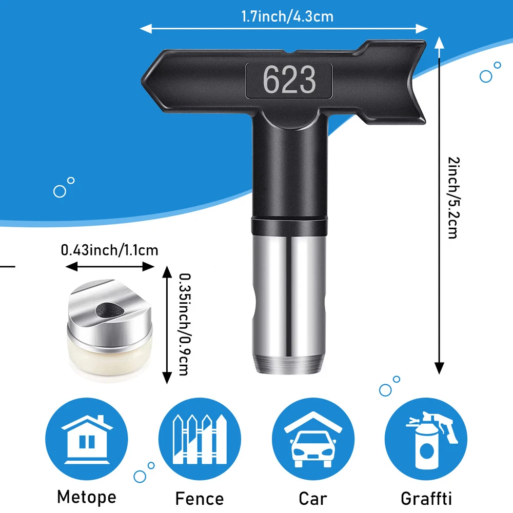Product Description Characteristics: - [Wide compatibility] Available in 211 313 415 517 623 213 315 417 519 621 109 413, airless sprayer nozzles compatible with most airless sprayers; The spray range will vary depending on the size of the aperture and is perfectly suited to your daily use and replacement needs - [Quality material] Double-sided airless nozzle made of tungsten steel, strong and wear-resistant, easy to clean, long service life - [Easy installation] No installation tools, just a few steps to install the airless nozzle on the sprayer; First use the nozzle to seal the nozzle in the protection seat, and then insert the nozzle into the protection seat to rotate to complete the installation, saving time and effort for your project - [Feature HEA Technology] Nozzles reduce overspraying by up to 55% while providing softer spraying, improved control, and a more consistent finish. Save more paint. Suitable for paint, furniture, fence, home decoration, industrial fine drawing decoration, etc -【 Practical design 】 Airless sprayer nozzle has reverse airless cleaning switch nozzle design, spray can be quickly cleaned in reversible position, prevent nozzle clogging, practical and effective for your work Specifications: - Material: stainless steel + tungsten steel - Color: Black/blue/yellow - Model compatibility: 211 313 415 517 623 213 315 417 519 621 109 413 Package materials include: -1* Nozzle
