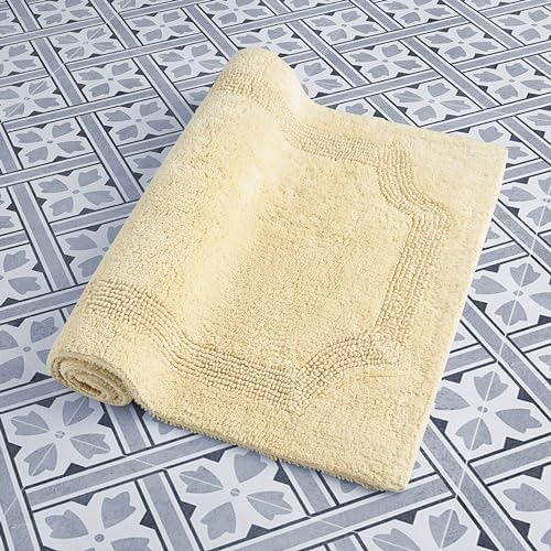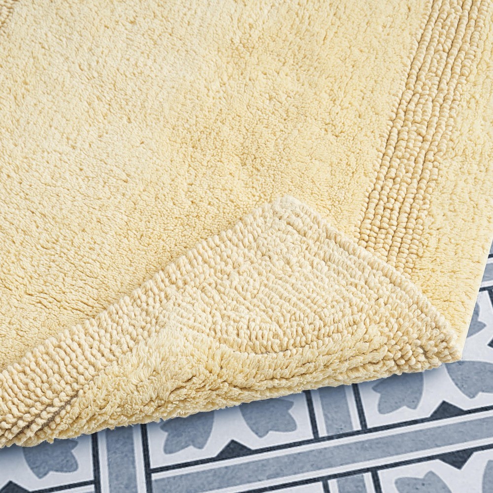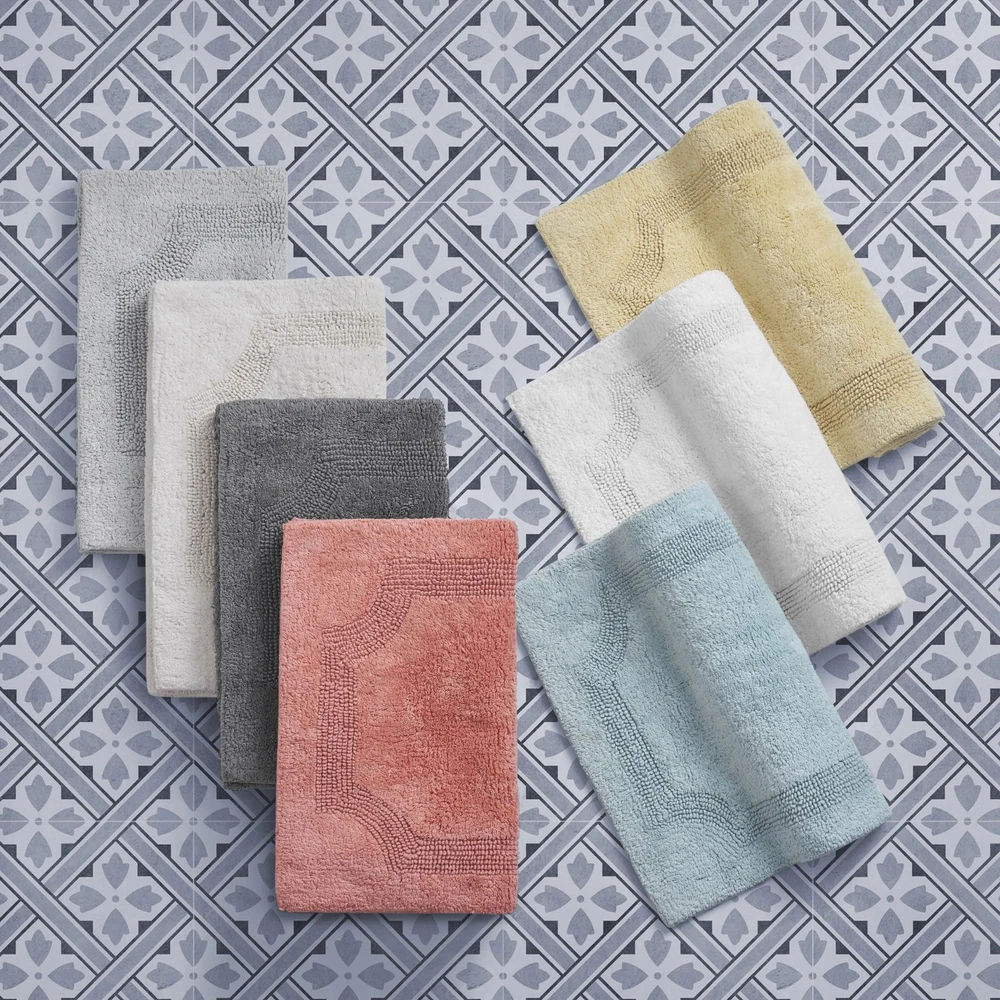 2-piece set includes (1) 17" x 24" and (1) 20" x 32" bath rugs Super plush and absorbent 100% cotton Reversible for extended use and beauty Non-skid rug grippers recommended for uncarpeted floors including wood, tile or ceramic flooring (sold separately) Can also be placed on top of wall-to-wall carpeting or bare floors in a play room, child's bedroom, or den to inject a pop of color and accentuate existing décor