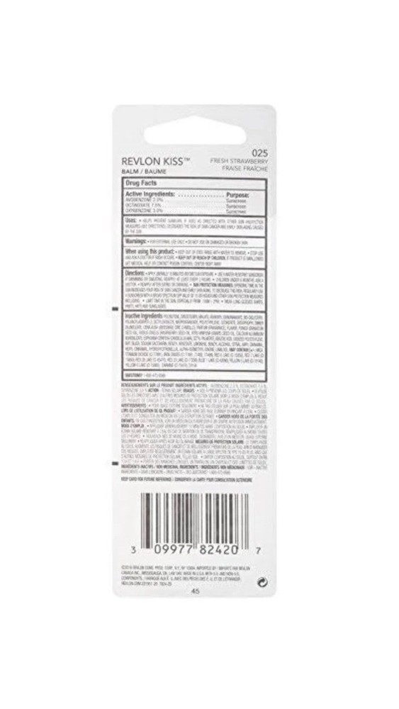 Brand:RevlonProduct Type:Lip Balms And Moisturizersgtin13:309977824207Product Line:Revlon KissMPN:025Color:StrawberrySize:0.09 Ounce (Pack of 1)Manufacturer:CLACKAMAS RECLAMATION CENTER | FRED MEYERType:Lip Balms And MoisturizersFormulation:BalmUPC:309977824207