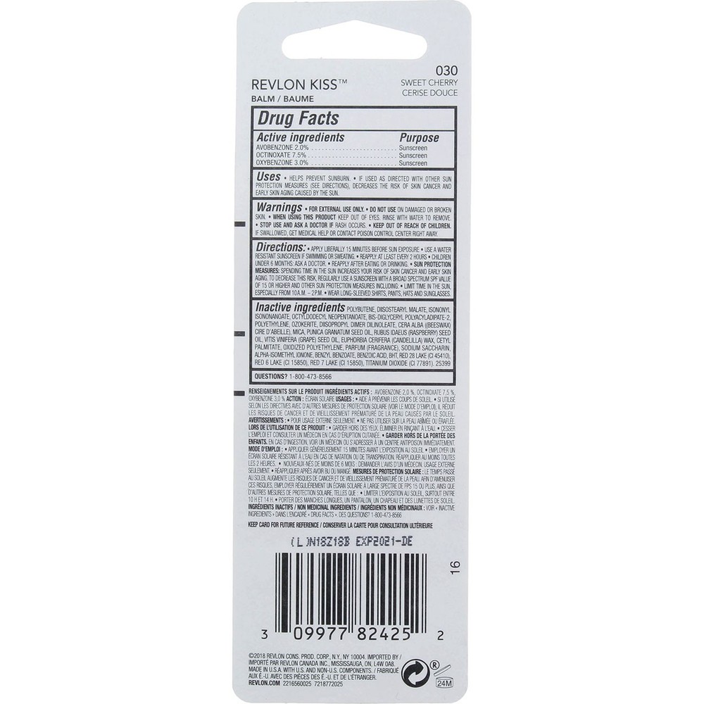 Product Description Get instantly softer, smoother, kissable lips with Revlon Kiss Balm. Infused with natural fruit oils, the nourishing formula delivers ultra-hydrating lip care and sheer, juicy color that glides on smooth. With SPF 20 protection and 5 fresh fruit flavors, this lip balm provides lasting hydration and a beautiful, smooth shine. Instructions Apply directly to bare lips Enjoy a subtle tint of sheer color with a touch of shine Product Description Get instantly softer, smoother, kissable lips with Revlon Kiss Balm. Infused with natural fruit oils, the nourishing formula delivers ultra-hydrating lip care and sheer, juicy color that glides on smooth. With SPF 20 protection and 5 fresh fruit flavors, this lip balm provides lasting hydration and a beautiful, smooth shine. Instructions Apply directly to bare lips Enjoy a subtle tint of sheer color with a touch of shine Disclaimer The product descriptions and instructions provided by Vitabox are for informational purposes only and are qualified in their entirety by the information available from manufacturers of the products. You should carefully read all product packaging, and contact the manufacturer with any questions before using a product. While we endeavor to ensure that product descriptions are current, manufacturers sometimes change their products. We are not liable for inaccuracies or misstatements about products. We do not provide medical advice or recommendations. You should not use the information provided by Vitabox for diagnosing or treating a health problem or disease. If you have or suspect that you have a medical problem, immediately contact your health care provider. Information and statements regarding dietary supplements have not been evaluated by the Food and Drug Administration or any other government agency and are not intended to diagnose, treat, cure, or prevent any disease.