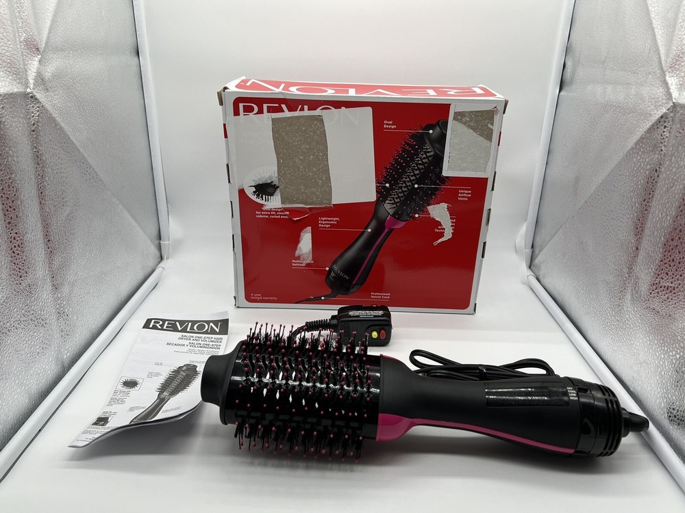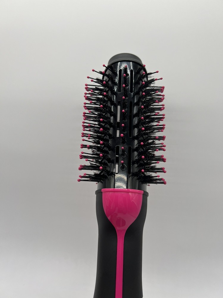 Revlon One-Step Hair Dryer Brush and Volumizer Oval Pink Black. Used, tested it works, still in good condition. Item: P4(16) VOTED “BEST BLOW-DRY BRUSH”: Simplify your getting-ready routine with this fan favorite. TWO-IN-ONE TOOL: Dry and style in up to half the time* and get that just-left-the-salon feeling without leaving home. 2.8” BRUSH: Styles all hair types and lengths, its wide surface area is great for long hair. SALON-STYLE BLOWOUTS: Get shine, tons of volume and a smooth finish, plus create soft waves and body. THREE HEAT/SPEED SETTINGS: Choose from cool, low or high to dry and style with up to 50% less heat exposure for less damage.