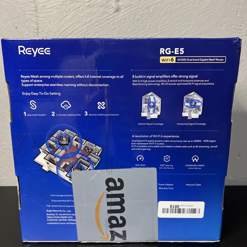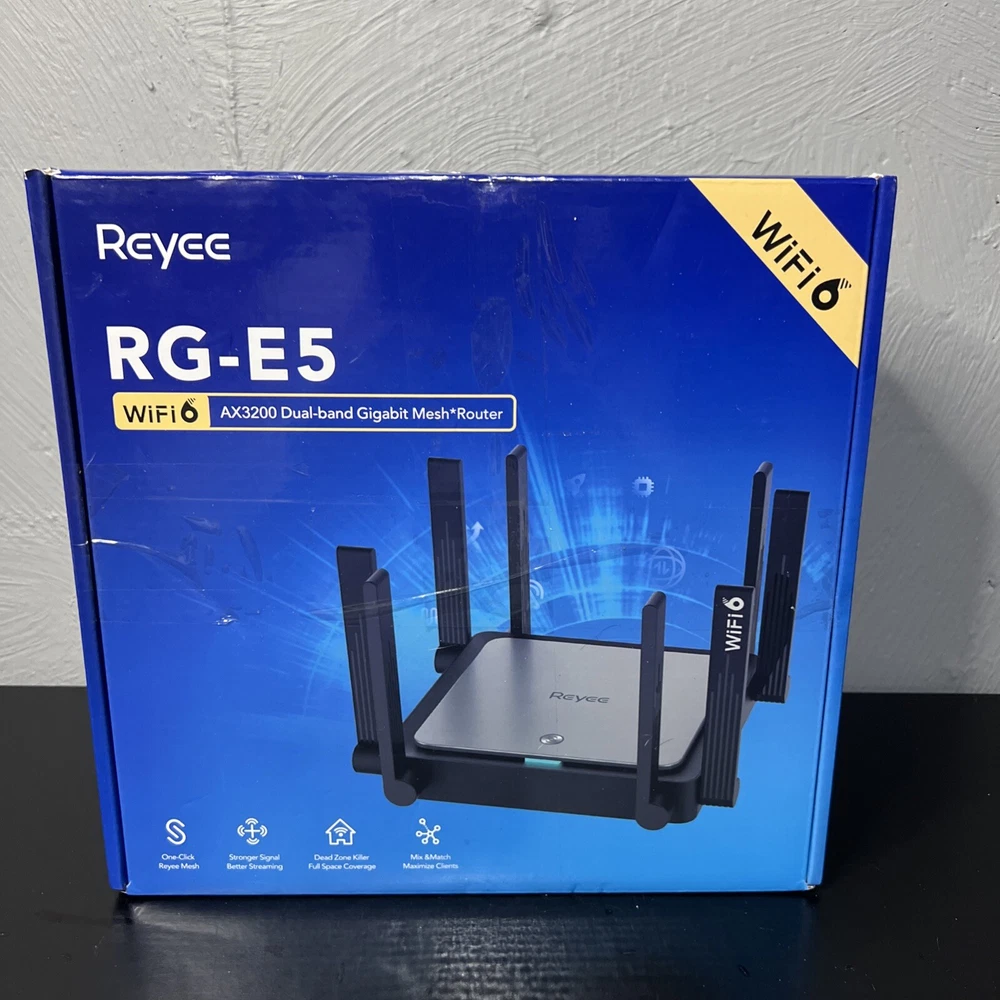 Introducing the Reyee RG-E5 WiFi 6 AX3200 Dual-Band Gigabit Mesh Router, the perfect addition to any home networking setup. This high-speed internet router boasts a range of features including dual-band and gigabit Ethernet ports for fast internet speeds. The Reyee RG-E5 is designed for optimal performance and reliability, making it an excellent choice for anyone in need of a reliable internet router. With its sleek design and advanced technology, the Reyee RG-E5 is a must-have for anyone looking to upgrade their home networking setup. Whether you're a casual internet user or a heavy gamer, this router is sure to provide you with fast and reliable internet speeds. So why wait? Order your Reyee RG-E5 today and experience the difference for yourself!