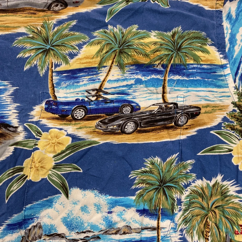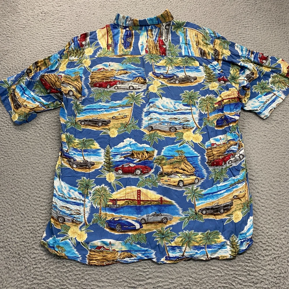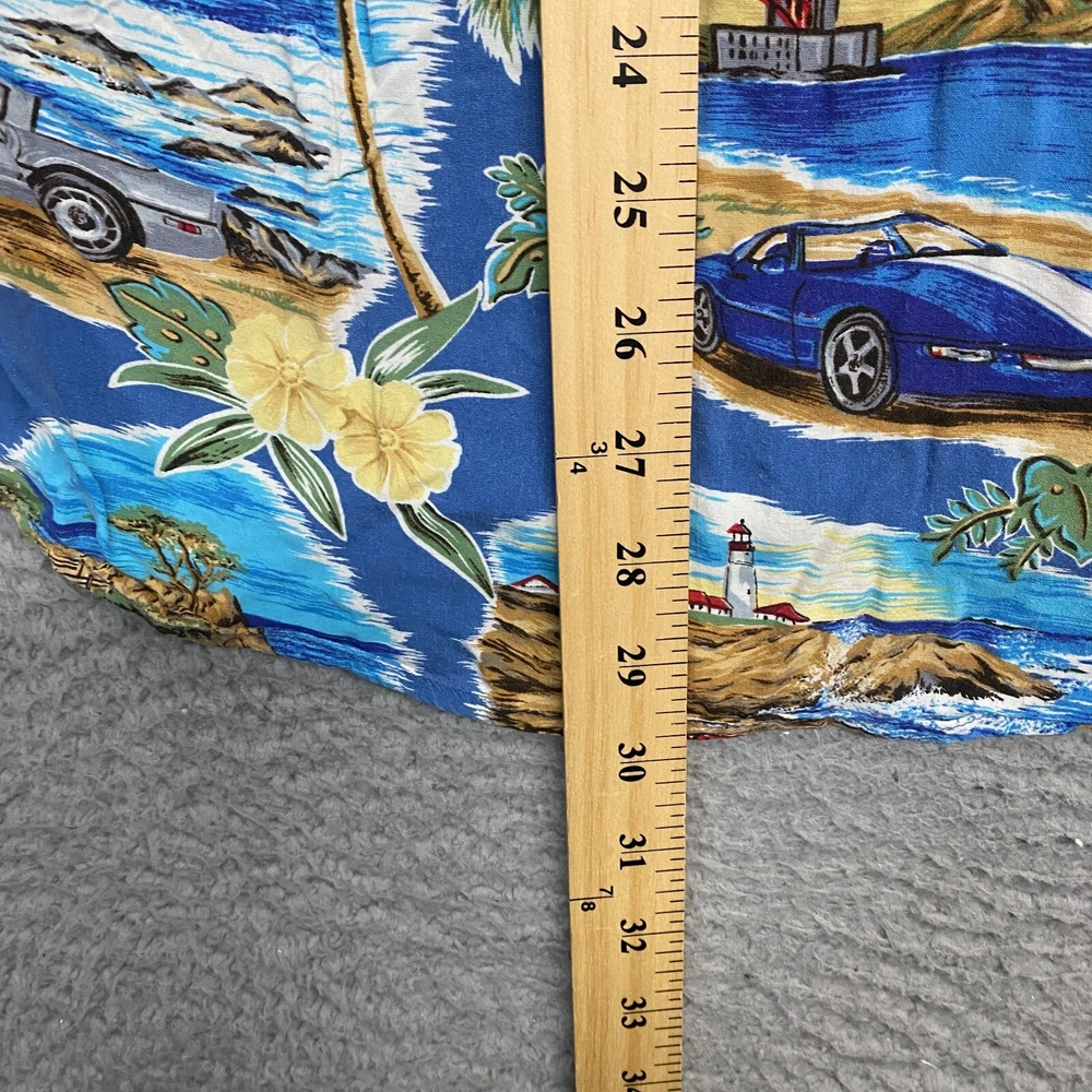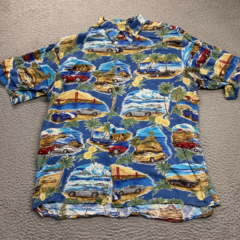 Reyn Spooner Hawaiian Shirt Mens XL Chevrolet Corvette Classic Cars Rayon Small holes on the front/bottom See photos for measurements