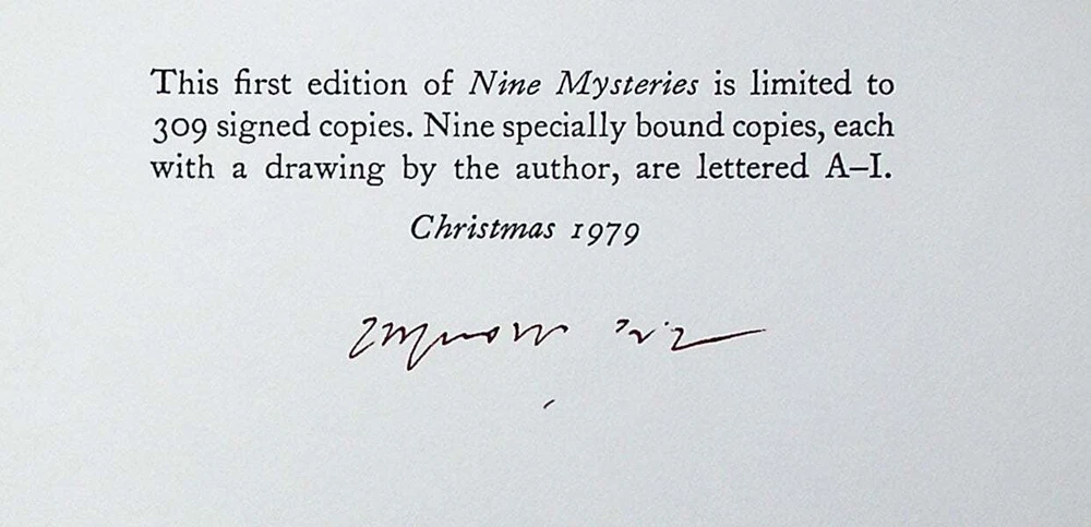 Nine Mysteries (Four Joyful, Four Sorrowful, One Glorious) [Limited Edition, Signed] Author: PRICE, Reynolds Title: Nine Mysteries (Four Joyful, Four Sorrowful, One Glorious) [Limited Edition, Signed] Publication: [Winston-Salem]: Palaemon Press, 1979 Edition: First, Limited Edition Description: One of 300 copies signed by the author. Small quarto (25.25cm); full black cloth, with title stamped in gilt on spine and in blind to front cover; [6],7-29,[3]pp. Gentle sunning to spine, a few faint scuffs to covers; Near Fine. Seller ID: 59367 Subject: Modern Poetry Lorne Bair Rare Books, ABAA Winchester VA We are one of the country's leading specialists in the history, literature and art of American social movements. Over 25,000 items in-stock in the heart of Virginia's Shenandoah Valley. Guarantee Our items are described using AB Bookman standards - the standard grading terms of the trade, originally promulgated by the trade publication The Antiquarian Bookman's Weekly back in 1949. We tend to be conservative in our grading, but even the best booksellers make an occasional mistake. Thus, we offer the following guarantee: All items will be received as advertised and in the condition described. Any item is returnable for any reason within 30 days of receipt (prior notice appreciated). If you have questions regarding our description of any item, we encourage you to contact us prior to bidding. We are members of the ABAA (Antiquarian Booksellers Association of America) and the Independent Online Booksellers Association (IOBA), and we adhere to these associations' strict ethical guidelines and conditions of sale. Shipping Standard domestic shipping is by USPS Insured Media Mail, at flat rate of $5. Delivery typically takes seven to ten business days depending on destination. Please be aware that, during the COVID emergency, delivery times have been delayed. We strongly recommend upgrading to Priority Mail if your order is time-sensitive! FOR DOMESTIC ORDERS ONLY we are happy to combine shipping on multiple items purchased at the same time that can be included in the same parcel. Again, please contact us prior to paying your invoice to arrange combined shipments. If you are overcharged for shipping by eBay, we will send you a prompt refund once the actual shipping cost has been determined. Overseas shipping is now managed through the eBay Global Shipping Program. All rates and fees are set by eBay, not the seller. We cannot alter a Global Shipping invoice once it has been generated; any queries should be directed to eBay Customer Support in your home country. Payment Payment is expected within 48 hours of purchase unless other arrangements have been made prior to sale. We ship all orders within 24 hours after receiving payment. Feedback We leave feedback for buyers once they have posted feedback for us. If you are unhappy with any aspect of a transaction with us, please contact us immediately. Our priority is to make customers happy and to resolve problems as promptly as possible. This listing was created by Bibliopolis.