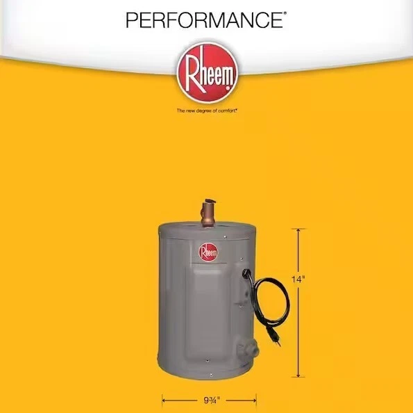 The Rheem Performance 2.5 Gal. Electric Point-of-Use Water Heater has a space-saving, point-of-use design that's perfect for under-counter installations that require a quick source of hot water for a single application. Supplied with a single 1440-Watt heating element and a factory-installed temperature-and-pressure relief valve. This heater comes with a convenient 120-Volt 3 prong plug for easy installation. 2.5 Gal. tank provides a small amount of hot water and is ideal for point of single point of use applications Electric water heater is easy to maintain Factory installed pressure and temperature relief valve Single 1440-Watt heating element Requires a 120-Volt connection for installation 120-Volt 3-prong plug included for fast, easy installation Space saving design for installation in limited spaces UL approved for use in manufactured housing Mounting bracket included with water heater Designed for easy replacement of your existing water heater Now features a brass drain valve for added resiliency & durability Shipping Your order will be shipped same day for orders received before noon (E.S.T.). All orders ship FedEx or UPS. You can expect to receive your order within 2-5 days after shipment. In an unlikely event that your order is lost or damaged in transit, it is eligible for full refund or replacement. Return Exchange Policy We offer a hassle-free 30-day return policy . You can return unopened items in the original packaging within 30 days of your purchase. If 30 days or more have passed since your purchase, we cannot offer you a refund or an exchange. Since we do not charge any restocking fee, items must be returned in the exact condition in which they were received with all the packaging. Refunds of your purchase price will automatically be applied to your original method of payment.