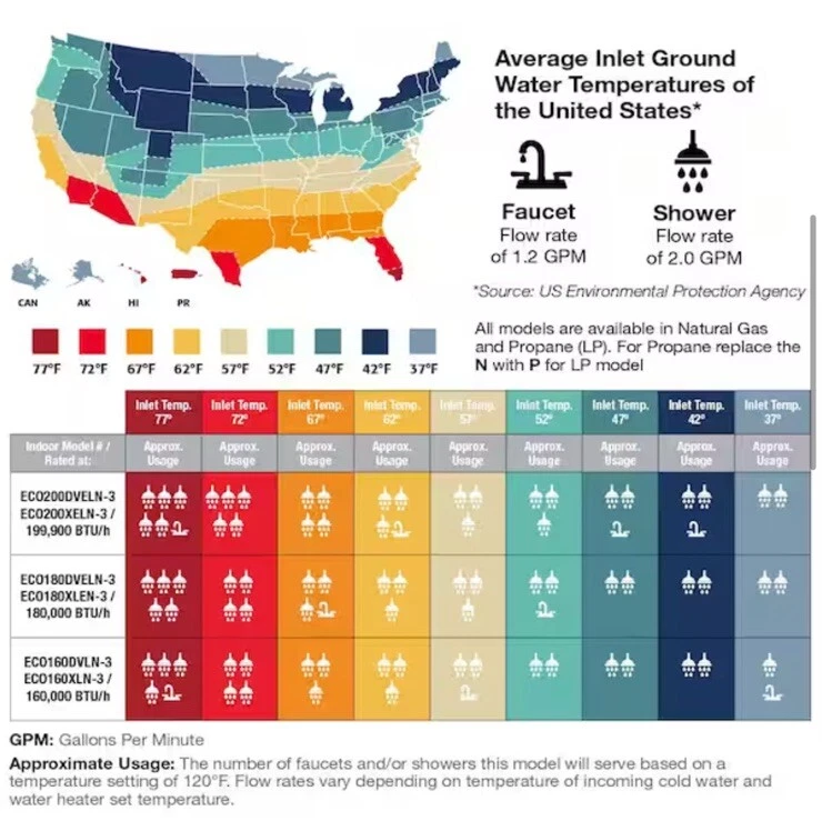 The Rheem ECO200XELP-3 Performance Plus High Efficiency Outdoor Liquid Propane Tankless Water Heater can provide up to 9.5 GPM at a 35° temperature rise. The 199,900 BTU High Efficiency Liquid Propane Tankless Water Heater is designed to supply continuous, on demand hot water for up to 3 bathrooms at the same time. It heats water only when it's needed and has a 0.82 uniform energy factor. Plus, it's smart: built-in Wi-Fi Technology provides valuable alerts and control from anywhere with a smart phone. This compact water heater may be eligible for local utility rebate programs. This model's outdoor design requires no additional venting and features freeze protection to -30°F. Please the specifications to view the Rheem Brochure Guide which will help you in your buying decision to ensure that you purchase the right tankless hot water heater model for your household needs. Continuous hot water: Rheem performance plus tankless water heaters heat water when you need it, for as long as you need it Outdoor model: outdoor tankless gas water heaters require no additional venting Saves water: save up to 1,100 Gal. of water per year with our exclusive water savings setting Saves energy: tankless water heaters heat water only when you need it which saves on energy costs, this model is up to 34% more efficient than a standard 50 Gal. gas tank water heater (based on comparison of Rheem RTG-series models against a standard residential 50 Gal. tank model with like fuel type; LP models may be higher) 9.5 GPM (Gallons Per Minute) can provide enough hot water to supply up to 3 bathrooms at the same time (at a 35° temperature rise) Smart: built-in Wi-Fi technology provides valuable alerts and control, like temperature settings, from anywhere with a smart phone (Rheem econet app required) Easy to own: our maintenance notice setting alerts you with a flashing warning code when it is time to call for a regular service check and our hard water build-up indicator automatically displays a service alert if scale build-up is detected Warranty: 15-year heat exchanger, 5-year parts and 1-year labor warranty (registration required; see warranty for details) Installs outside for easy replacement of your existing outdoor unit and frees up space inside Environmentally friendly ultra-low NOx burner meets SCAQMD rule 1146.2 requirements Hot start programming helps to minimize fluctuation in water temperature during periods of frequent on/off operation High-altitude capability up to 7,800 ft. elevation above sea level Electricity required: supplied with a 120-Volt power cord Return Policy California residents see Prop 65 WARNINGS Product Information Internet # 325309446 Model # ECO200XELP-3 Store SKU # 1009624834 E-14