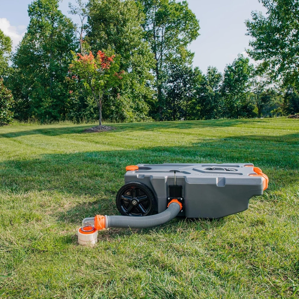WE SHIP FROM US → US, SO YOU WILL NOT PAY ANY IMPORT FEES. THE DE MINIMIS LAW DOES NOT AFFECT YOUR ORDER. Simplify RV Waste Disposal: Make waste disposal hassle-free with Camco's portable waste tank. Easily transport waste from your RV black water tank to a dump station— perfect for when you're parked far away & your RV sewer hose won't reach. Effortless Transport: Haul your waste with ease with no-flat wheels built for any terrain, an oversized handle for easy maneuvering, & a steel tow adapter for effortless towing behind a truck or golf cart. Tough & Reliable: Measuring 15 ½″ (L) x 25″ (W) x 46″ (H) and weighing 45 lb, this RV essential is constructed from durable, UV-stabilized blow-molded HDPE. It withstands outdoor use without leaks or sun damage. Patented Design Made In The USA: Rhino Tote Tanks are proudly manufactured in the USA with premium materials for unmatched durability. The patented design ensures exceptional craftsmanship and quality. RV Tote Tank Features: Rhino’s 36-Gallon Tote Tank is equipped with (2) oversized wheels, a large handle, tank rinser, ladder hook, and gate valve for easy use. Kit Accessories: This kit includes (1) tote tank, (1) 3' sewer hose w/swivel fittings, (1) 15″ female/female grey water hose, (1) clear elbow w/4-in-1, (1) clear double bayonet elbow, (4) storage caps, (2) caps w/lanyards, & (1) steel tow adapter. Easy To Clean: This RV camping must-have comes with a built-in gate valve for quick emptying. The smooth interior makes cleaning a breeze and the integrated tank rinser ensures a thorough cleanse with minimal effort. Simple To Store: Hang the portable waste water tank on your camper ladder using the ladder hook. Secure the Camco tote with tie-down straps that fit into grooves on the tank body. The 3' sewer hose compresses for storage.
