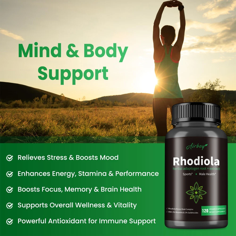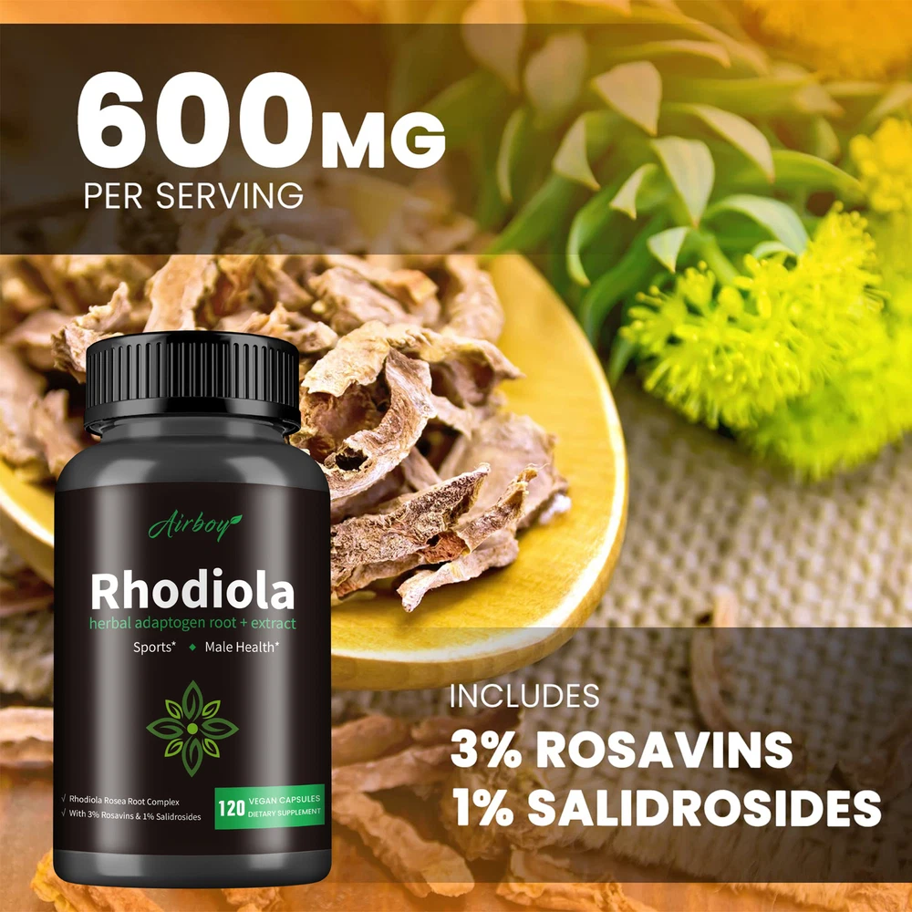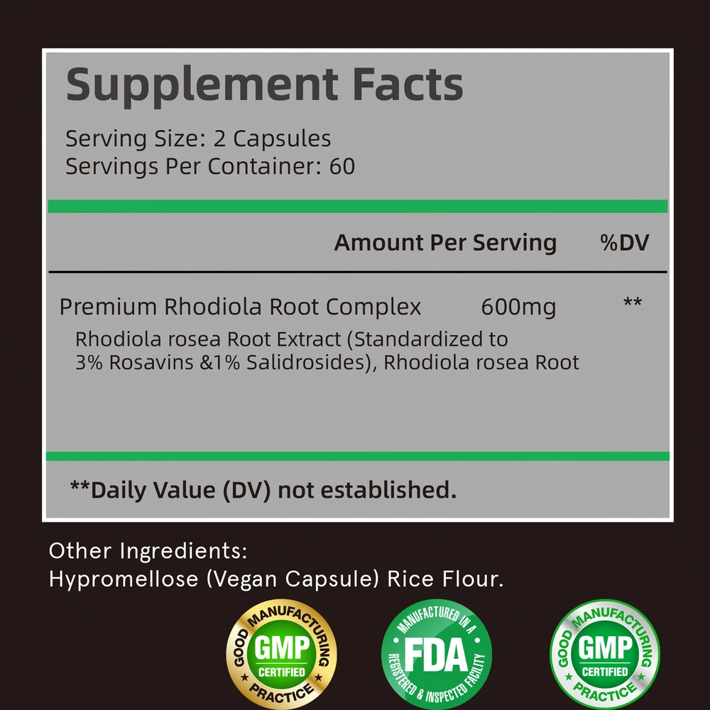 Effects: Energy & Endurance, Men's Health, Testosterone Booster Ingredients: Rhodiala Root Directions: Take 2 capsules once daily after a meal. Shipping: Ships within 48 hours on working days. Shelf life: 2 years Description: Relieve Stress and Boost Your Mood - Are you feeling brain fog, stressed, or exhausted? Rhodiola helps you fight the fog while leaving you relaxed and ready to take on your day. Whether you're having a busy day at the office, classroom, or home, Rhodiola can relax your mind while improving your focus, clarity, and mood. Boost Energy and Endurance - Looking for a clean boost of energy and mood? Our pure Rhodiola helps you stay focused and alert throughout the day so you can stay motivated, excel, and win the day. Rhodiola boosts immune support and defenses, stabilizing and maintaining your body and overall health to help you live a balanced, healthy life. Vegetarian & Non-GMO - Rhodiola is vegan, non-GMO, and gluten-free. Document