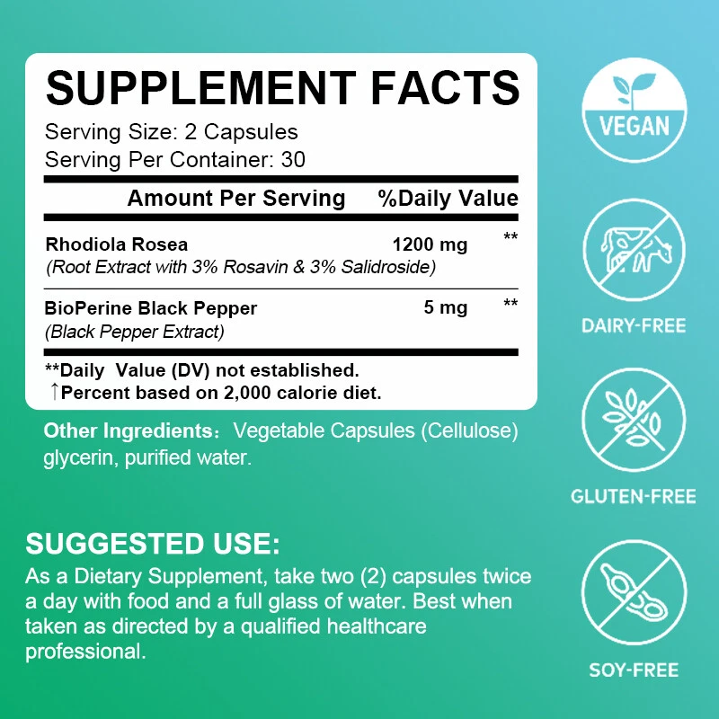 Store Categories Store Categories Other Rhodiola Rosea Root Extract 1200 Mg (60 Capsules) Product Description Description IMPROVES ENERGY, MOOD, AND PERFORMANCE: Rhodiola rosea helps increase energy levels, supports normal and elevated mood, and can even enhance physical and athletic performance. Additionally, rhodiola promotes a healthy immune system. Rhodiola rosea is an adaptogen that helps the body and mind adapt to stress. IMPROVES MEMORY AND BRAIN FUNCTION: Rhodiola rosea promotes healthy brain function and supports improved memory. Rhodiola rosea may improve blood and brain barrier absorption by supporting normal transport of the neurotransmitters serotonin and dopamine, which are essential for promoting healthy mood. Additionally, Rhodiola rosea has antioxidant properties. SHIPPING RETURNS FEEDBACK CONTACT US SHIPPING All the items will be dispatched within 3 business day after the payment is clear. There will be delays during special holidays We are not responsible for any custom duty or import tax. RETURNS 1. If you need return, please contact us with Email before open a case, let us know the detailed problem and send us some pictures for confirmation. 2. All returned items must be in the original packaging and provide us tracking number, specific reason for the returns. FEEDBACK Customer satisfaction is very important to us. If you have any problem with your order,please contact us and we will do our best to make you satisfied, please do not leave a negative feedback before we resolve your problem.We guarantee that your issue will be solved quickly. As long as you are happy with your purchase of , please leave us a positive feedback. Your feedback is very important to us it affects our search placement on eBay. CONTACT US If you have any queries, please contact us via ebay. We usually respond within 24 hours on weekdays. Copyright © 2023 Dianxiaomi