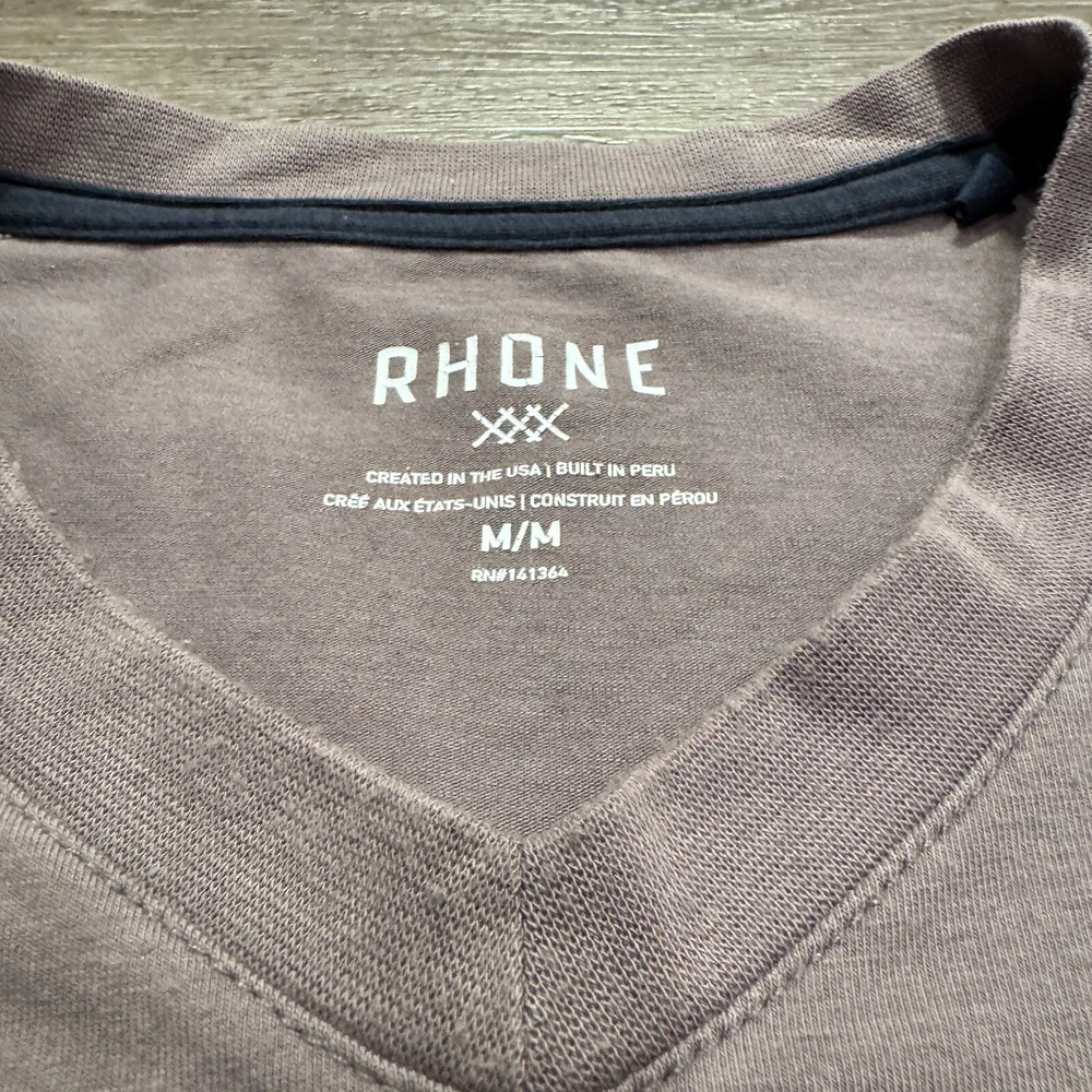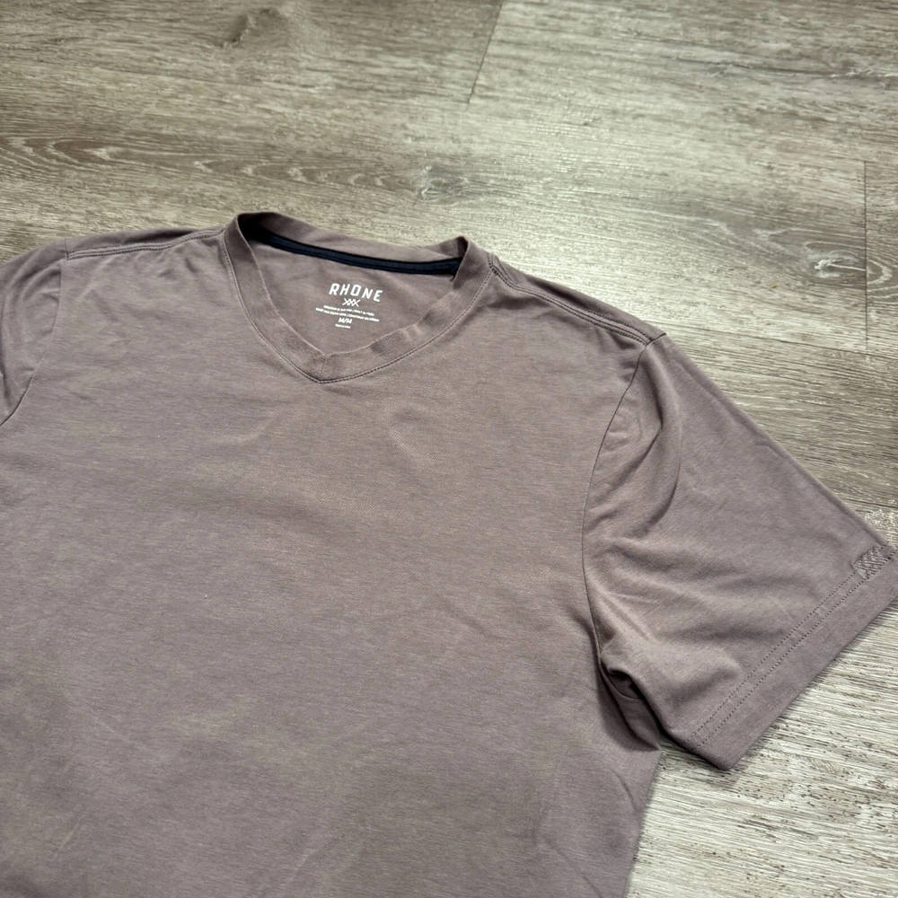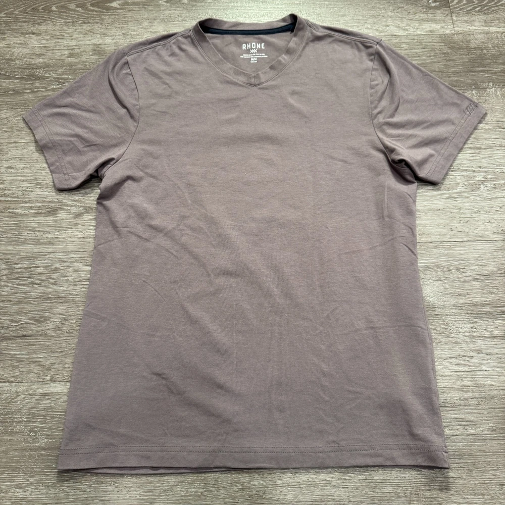 Brand: Rhone Type: T-Shirt Personalize: No Size Type: Regular Color: Gray Compression Level: Mild Fabric Type: Knit Material: Polyester, Spandex Accents: Embroidered, Logo Department: Men Style: Pullover Fit: Athletic Sleeve Type: Casual Sleeve Performance/Activity: CrossFit, Cross Training, Golf, Gym & Training, Hiking, Yoga Sleeve Length: Short Sleeve Fabric Wash: Medium Size: M Garment Care: Machine Washable Neckline: V-Neck Occasion: Activewear, Business, Casual Pattern: Solid Features: Stretch Closure: Pullover