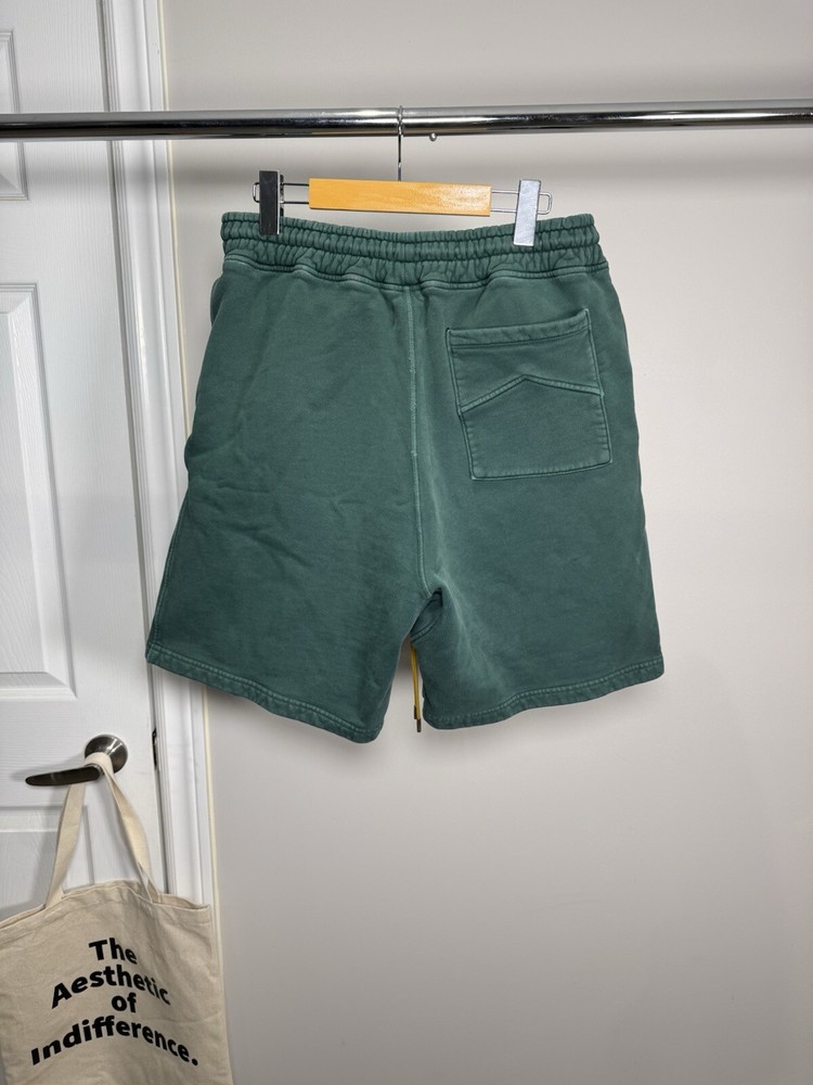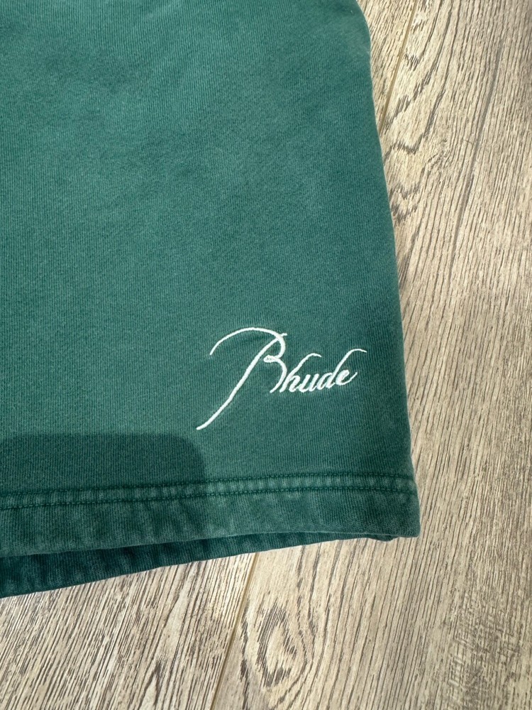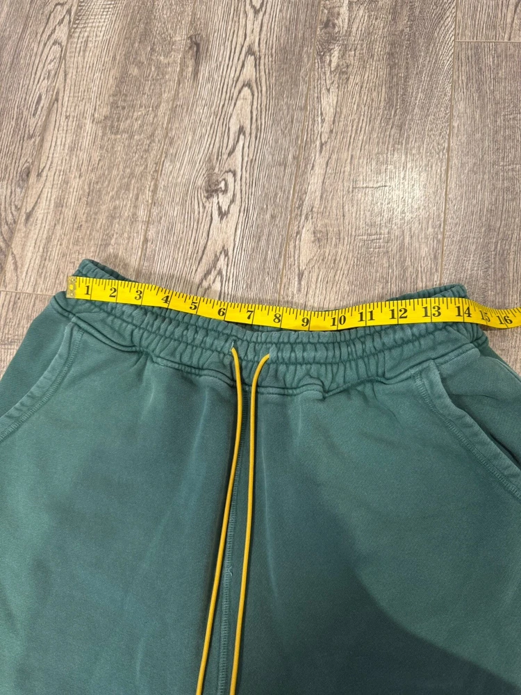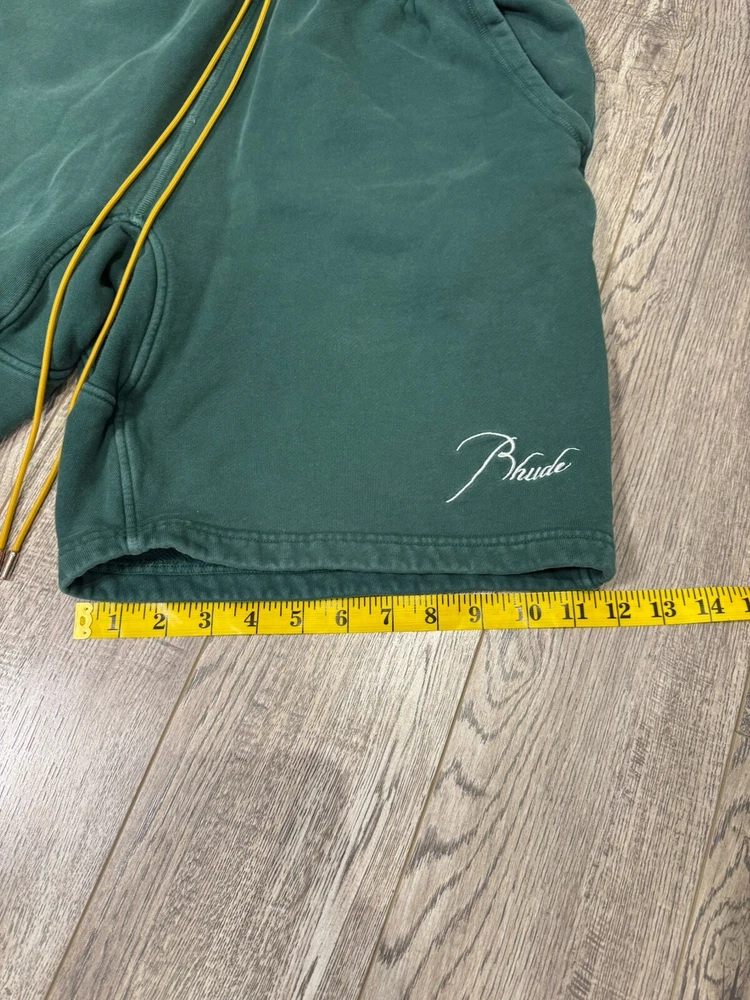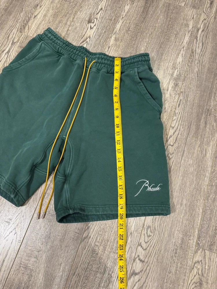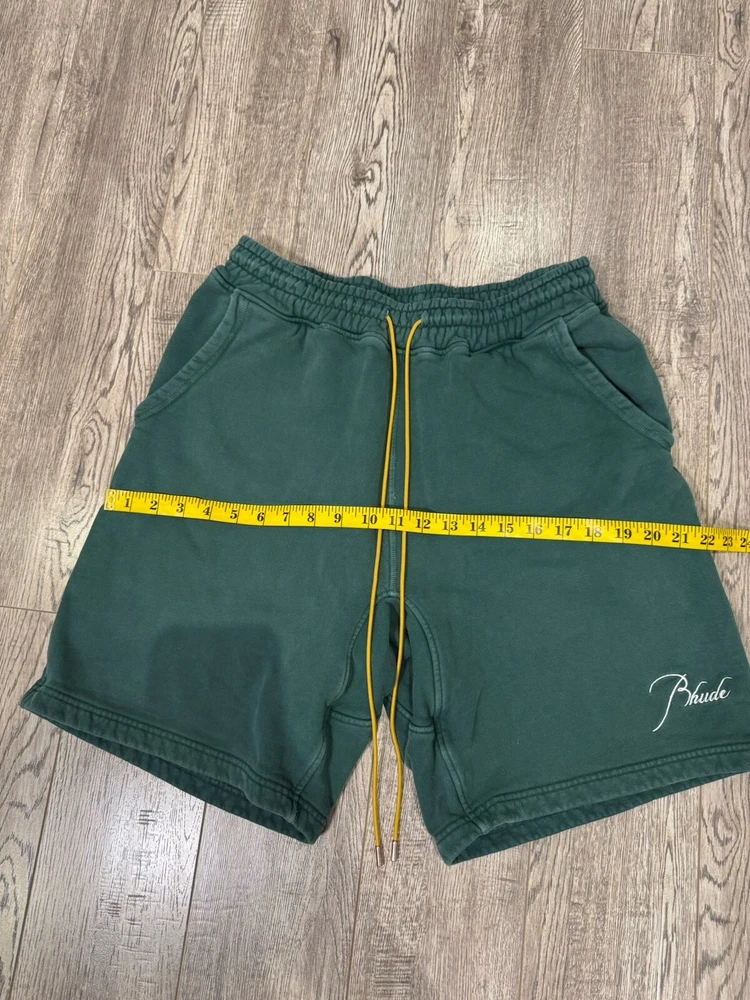 Stay comfortable and stylish in these RHUDE Green Sweat Shorts in size XL. Featuring an embroidered logo on the front, these shorts have a drawstring waist for a customizable fit. The back pocket provides convenient storage, making them perfect for casual wear or activewear occasions. Purchased on SSENSE proof of purchase available upon request measurements shown in photos please contact if you have any questions