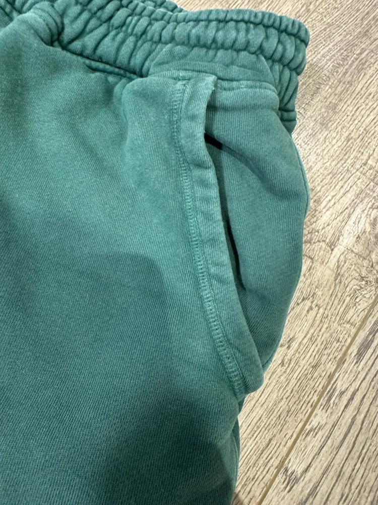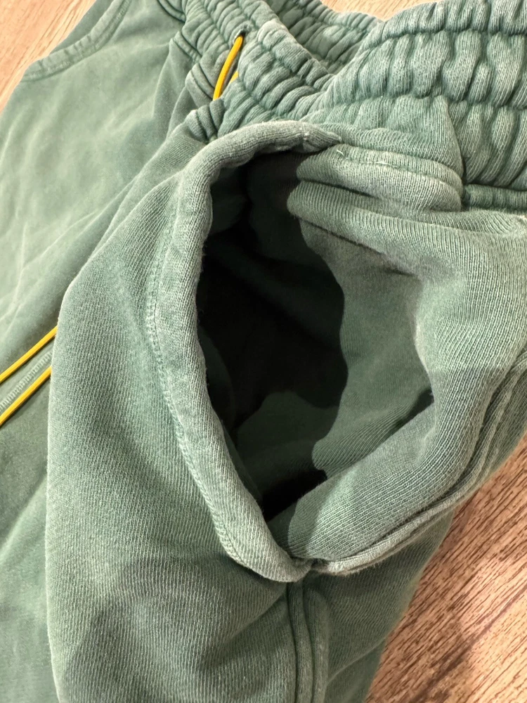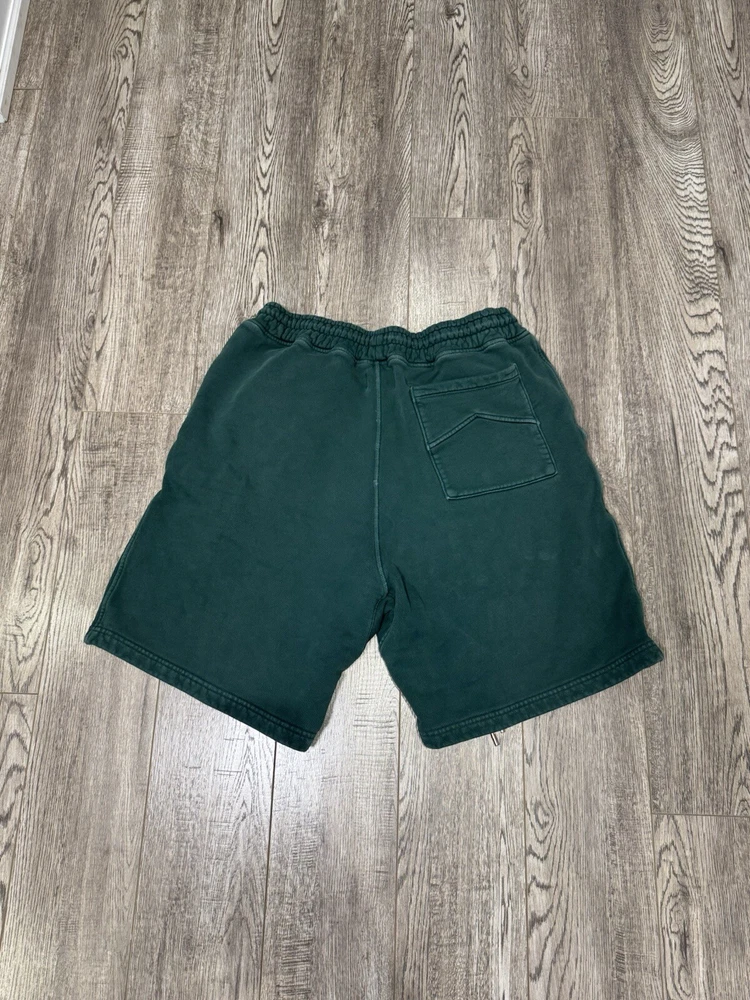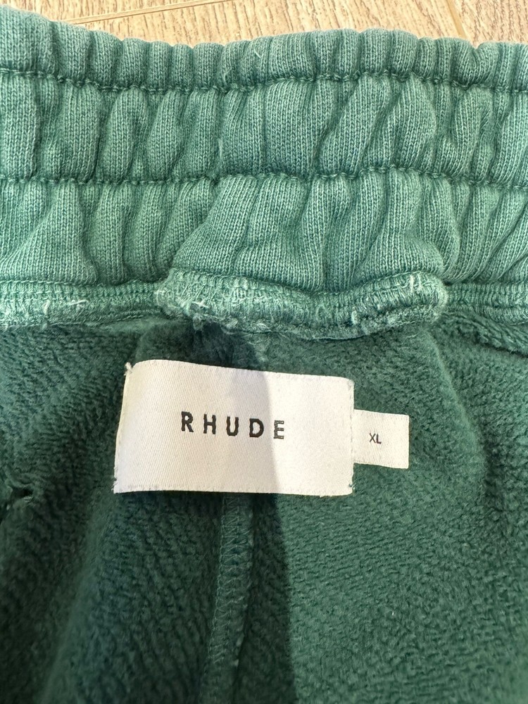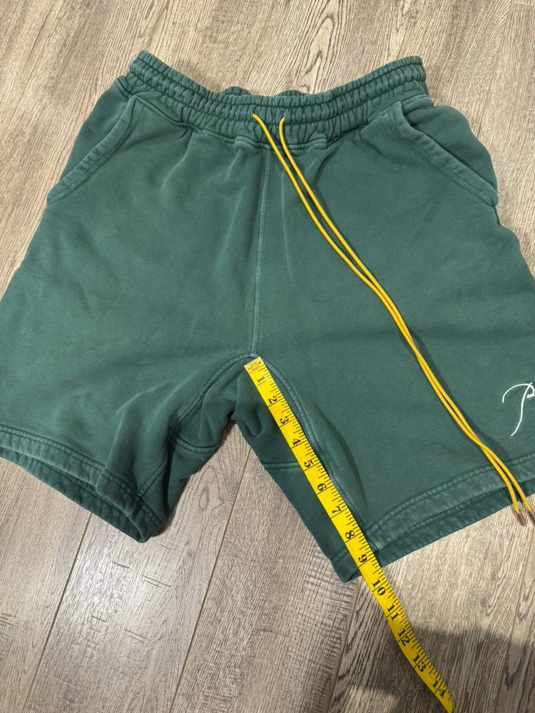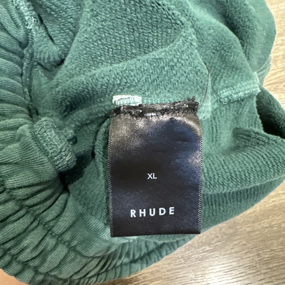 Stay comfortable and stylish in these RHUDE Green Sweat Shorts in size XL. Featuring an embroidered logo on the front, these shorts have a drawstring waist for a customizable fit. The back pocket provides convenient storage, making them perfect for casual wear or activewear occasions. Purchased on SSENSE proof of purchase available upon request measurements shown in photos please contact if you have any questions