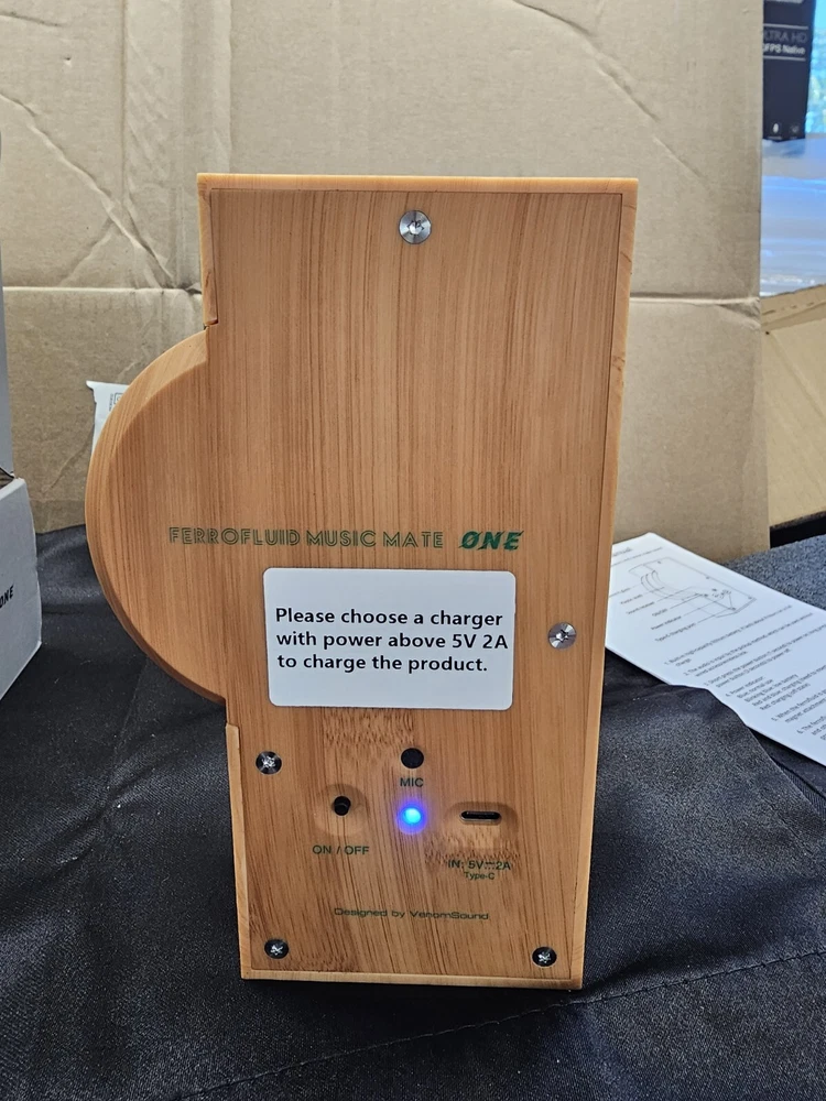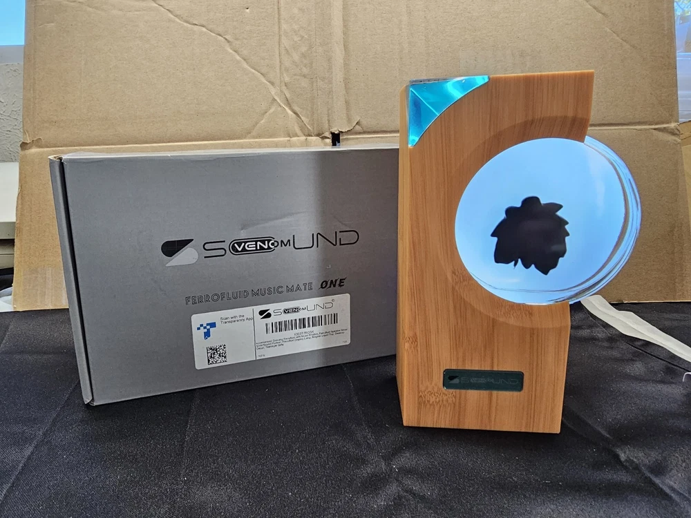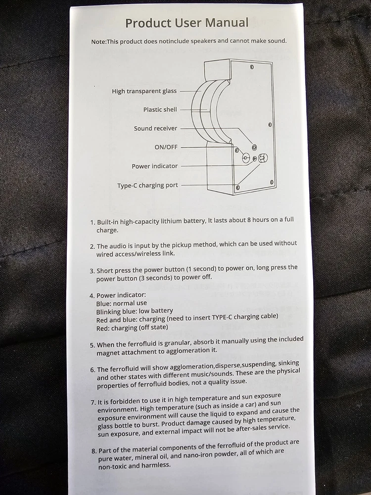 Not a speaker. Avoid high heats and laying the lamp down while on. The "Rhythm Ferrofluid Speaker Music Display Lamp" is a modern dancing ferrofluid display lamp that functions as a speaker and decorative piece. It features a sound sensor for activation, wireless connectivity, and is powered by batteries. The lamp is designed by Sovenomund and originates from China, with a sleek and stylish aesthetic suitable for rooms like the study, living room, bedroom, sunroom, or home office. This unique item, with a weight of 1.62 pounds and dimensions of 4.17 x 2.13 x 6.73 inches, offers a captivating visual display of magnetized liquid in motion, making it an ideal desktop decor or gift option. Thank you for browsing!!