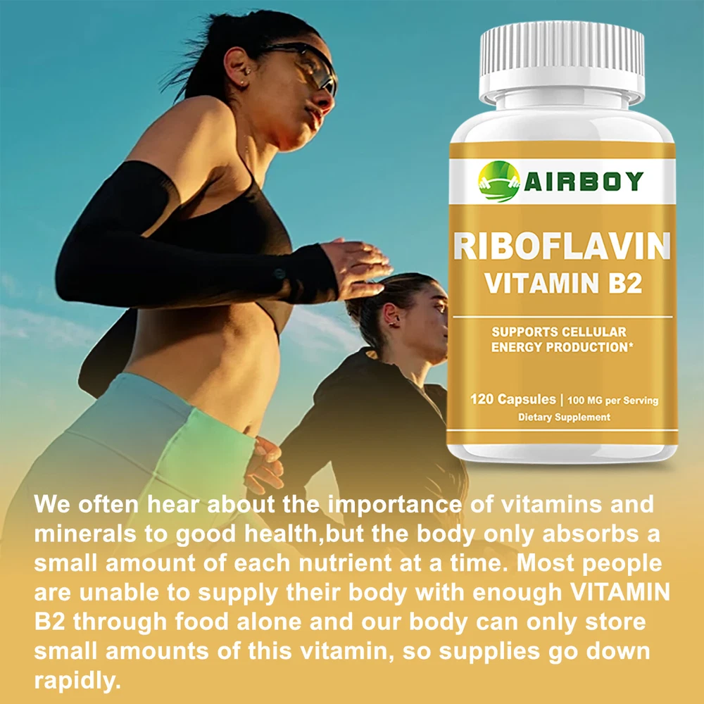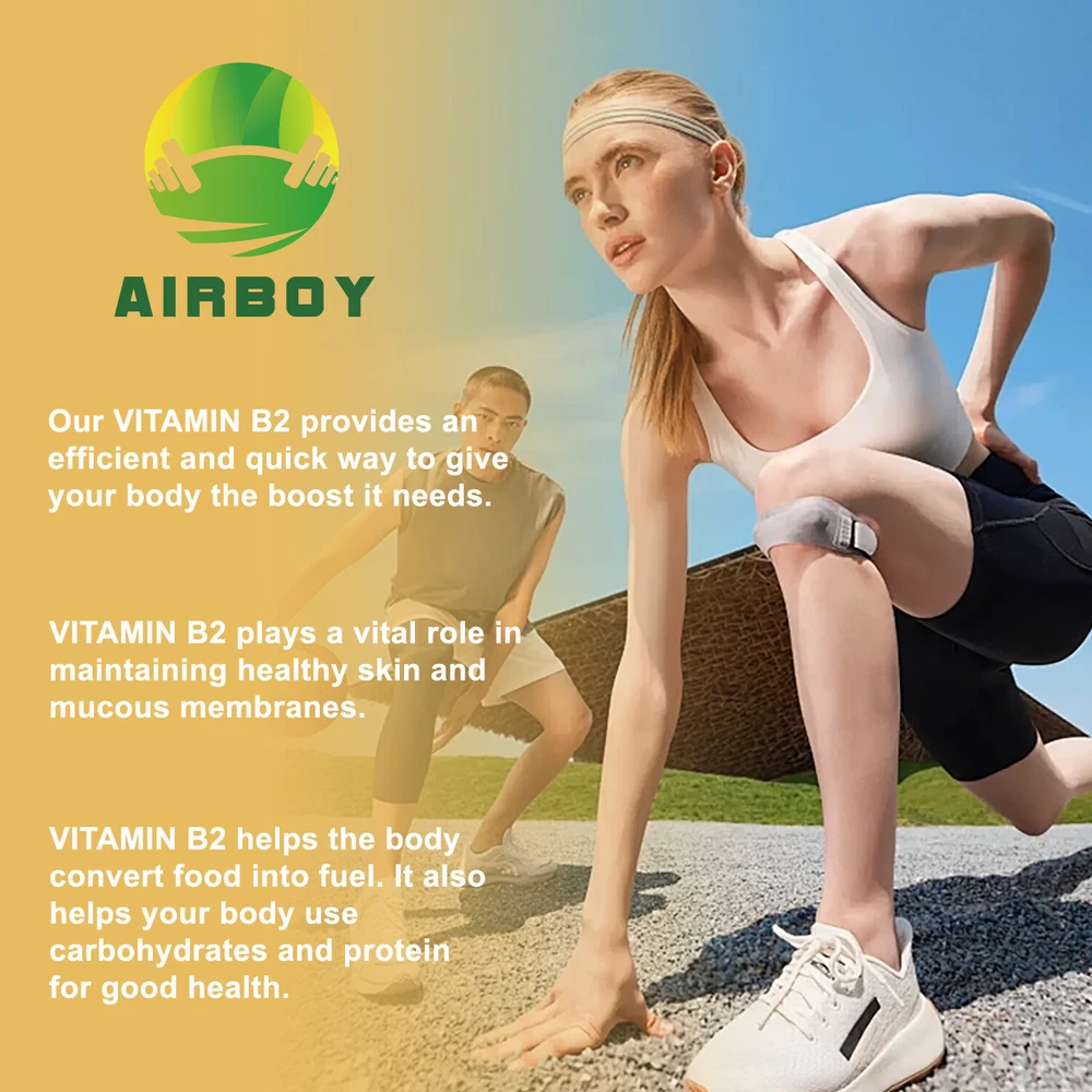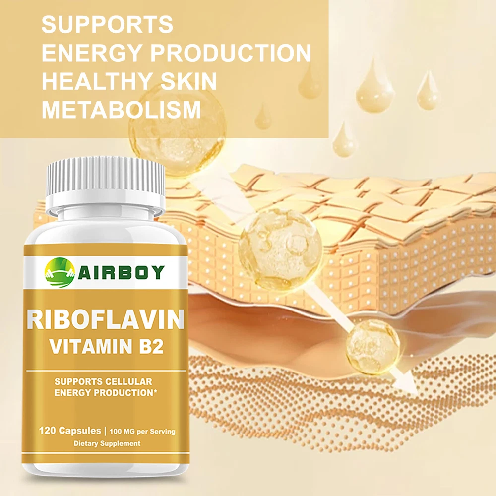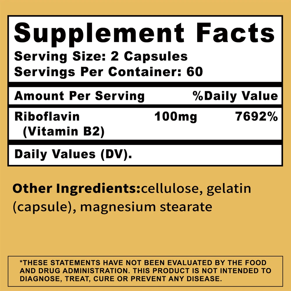 Effects: Energy Support, Metabolism Boost Ingredients: Vitamin B2 (Riboflavin) Directions: Take 2 capsules once daily after a meal. Shipping: Ships within 48 hours on working days. Shelf life: 2 years Description: Energy Production - Vitamin B2 is a nutrient that cannot be stored in the body, so it is recommended to be taken daily. It helps convert carbohydrates into glucose, which means it converts the food you eat into energy. Nervous System Health - Vitamin B2 (commonly known as riboflavin) is a member of the B vitamin family and supports a healthy nervous system. This potent source will help you support healthy hair growth, healthy nails, and vibrant skin. Also essential for helping maintain healthy cardiovascular and metabolic function. A potent source of healthy blood cells - Common symptoms of vitamin B2 deficiency include anemia, skin inflammation, fatigue, migraines and more. A premium vitamin B-2 formula that acts as an antioxidant in the body, helping you maintain healthy cells and metabolism. Document