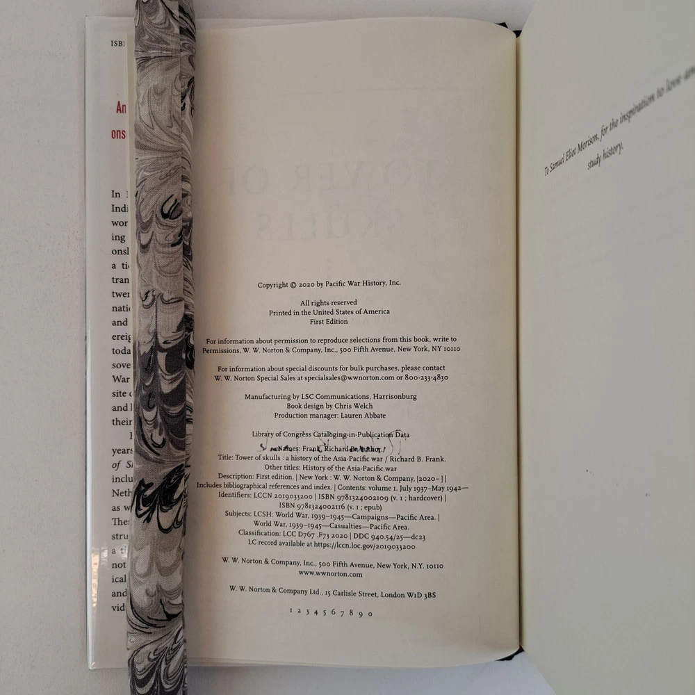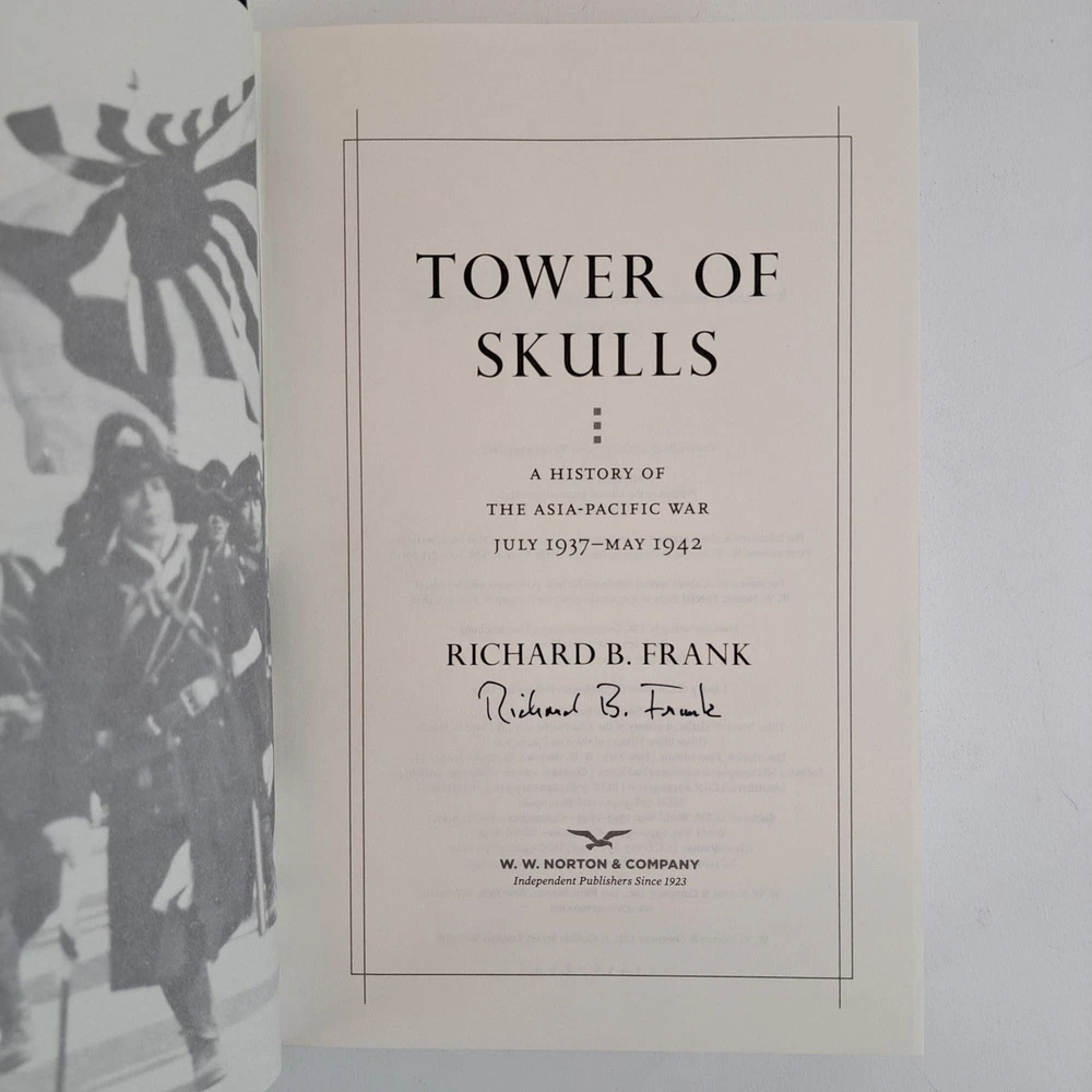TOWER OF SKULLS [Signed] Author: Frank, Richard B. Title: TOWER OF SKULLS [Signed] Publication: New York, New York: W.W. Norton, 2020 Edition: First Edition, First Printing Description: Octavo, 751 pages. In Very Good condition with Very Good condition dust jacket. Spine is black with white and red lettering. Dust jacket protected by mylar covering, price uncut: "$40.00" on front flap. Dust jacket protected by mylar covering, price uncut: "$40.00" on front flap. Signed on title page by Richard B. Frank. Shelved in hallway. Seller ID: 1389566 Subject: Warfare and Conflict, World History Welcome to the eBay store of Second Story Books! DC's Oldest Rare and Used Bookstore, Second Story Books operates two open shops in the Washington D.C. metropolitan area. We have an extensive internet presence and provide accredited appraisals member ASA. This listing was created by Bibliopolis.