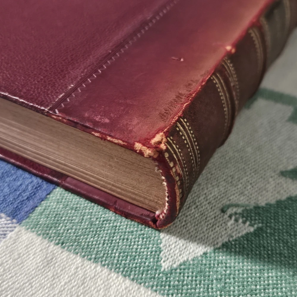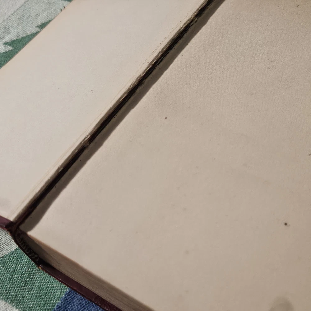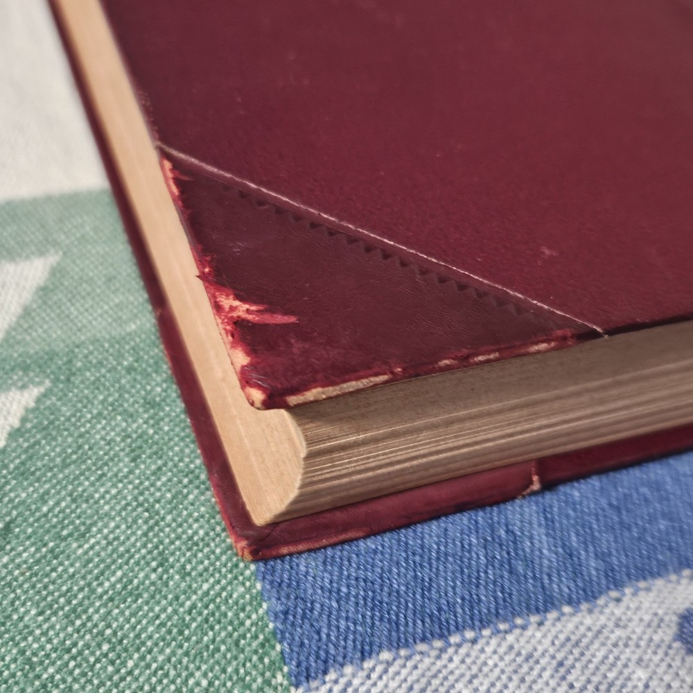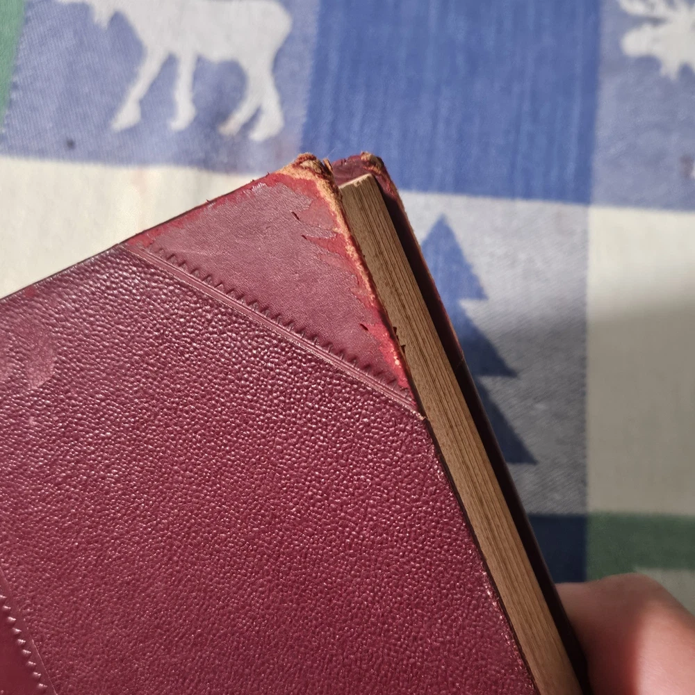 The front hinge is split, but the binding and pages are in good condition. The front cover has some wear but is in good condition overall. See photos