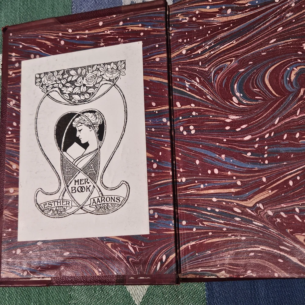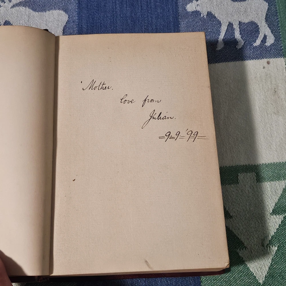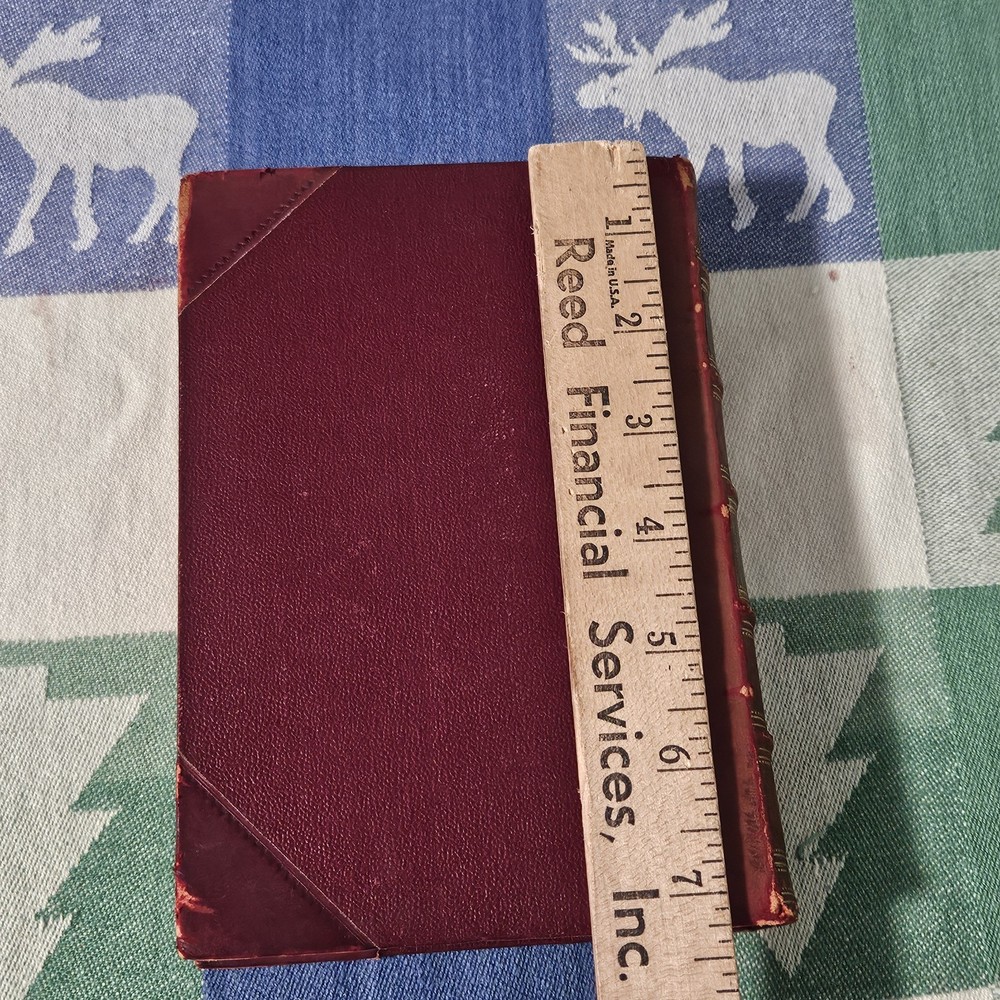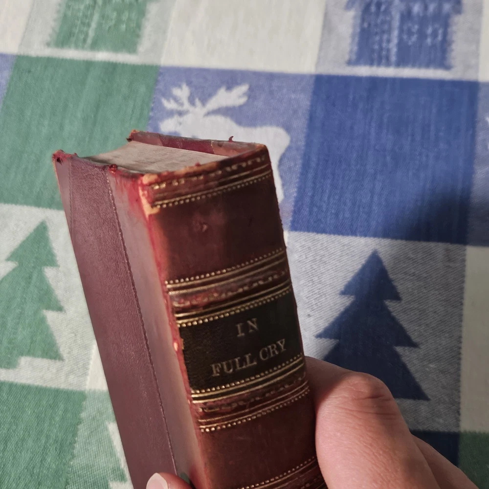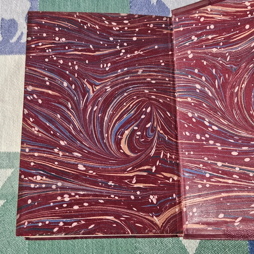 The front hinge is split, but the binding and pages are in good condition. The front cover has some wear but is in good condition overall. See photos