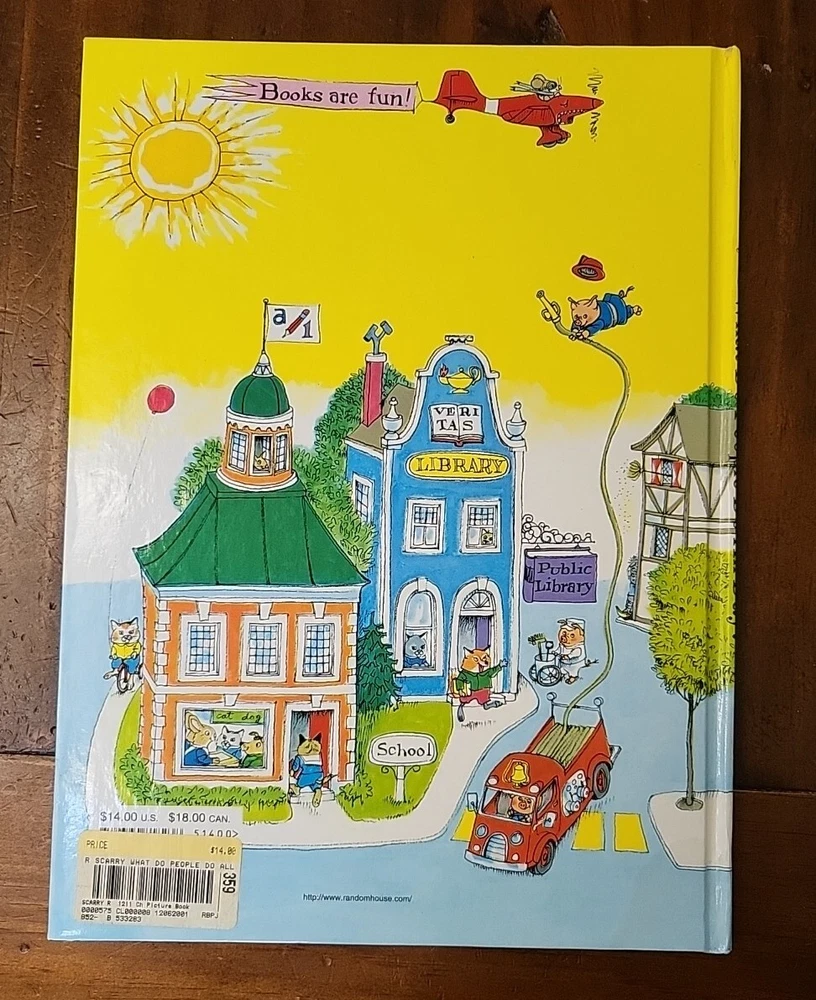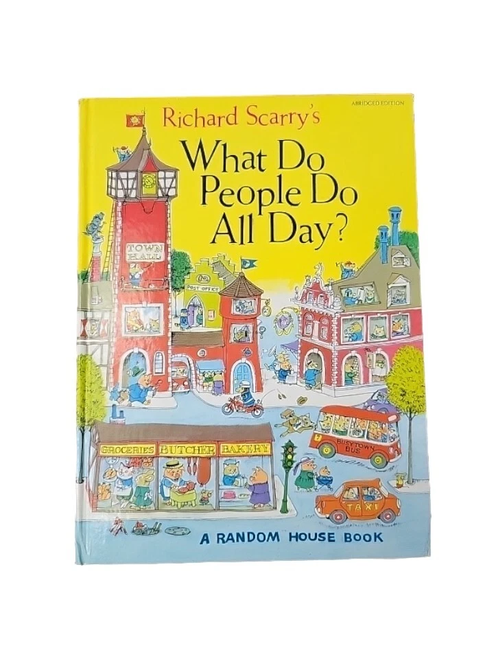 This is a vintage picture book titled "Richard Scarry's What Do People Do All Day?" by Richard Scarry. It was published in 2015 by Random House Children's Books and has 96 pages. The book is intended for ages 2-8 and features animals and transportation concepts. It weighs 26.1 ounces and measures 12.2 inches in length, 10.5 inches in width, and 0.5 inches in height. Some imperfect to outside shown in photo but the pages are all great . Awesome book .