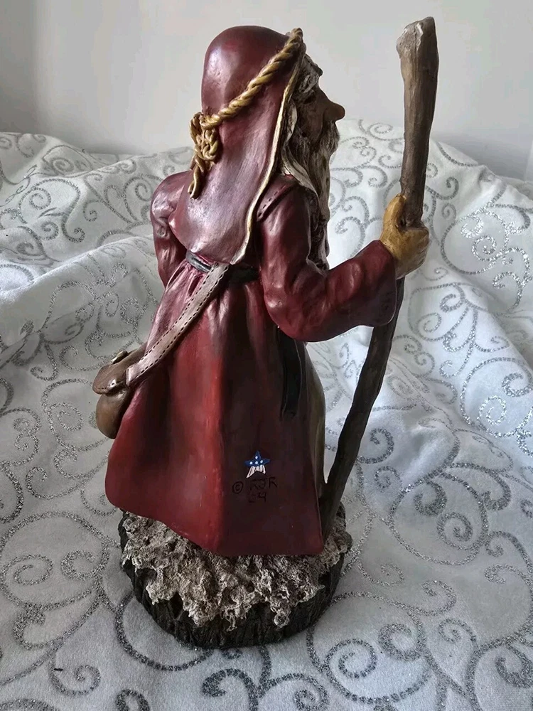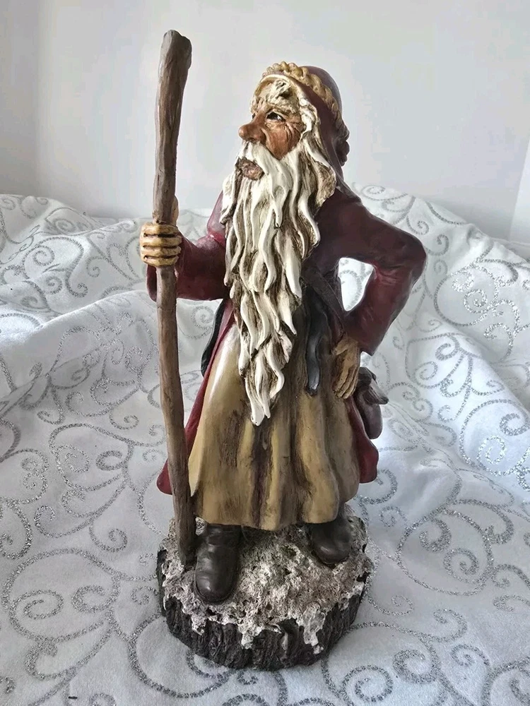 This beautiful sculpture titled "Wisdom" depicts an old man with a wise look on his face. The statue stands 9 inches tall and is made of plastic. It features intricate details and is artist signed by Rick J. Rowley. The sculpture has a abstract style and represents the culture of "Lost Woodsman". It is a perfect addition to any art collection.