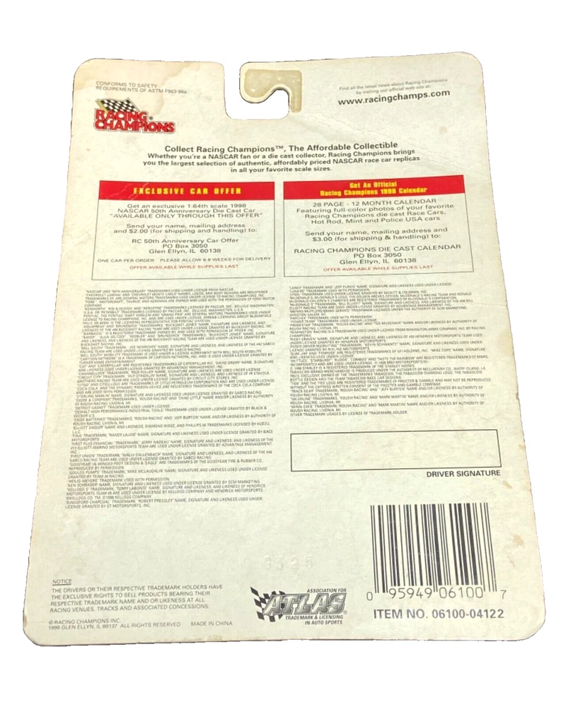 Age Level: 17 Years & Up gtin13: Does Not Apply Race series: Daytona MPN: Does Not Apply Vehicle Type: NASCAR Racecar Model: 50th Anniversary Material: Diecast Brand: Racing Champions Autographed: Yes Features: Advertising Specimen, Limited Edition, Unopened Box Theme: Nascar Country/Region of Manufacture: China Driver: Rick Mast Vehicle Make: Chevrolet Recommended Age Range: 17+ Series: 50th Anniversary UPC: Does Not Apply Character Family: Nascar Vehicle Year: 1998 Organization: NASCAR Color: Multi-Color Scale: 1:64
