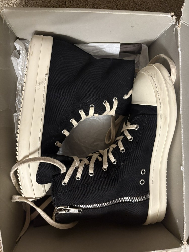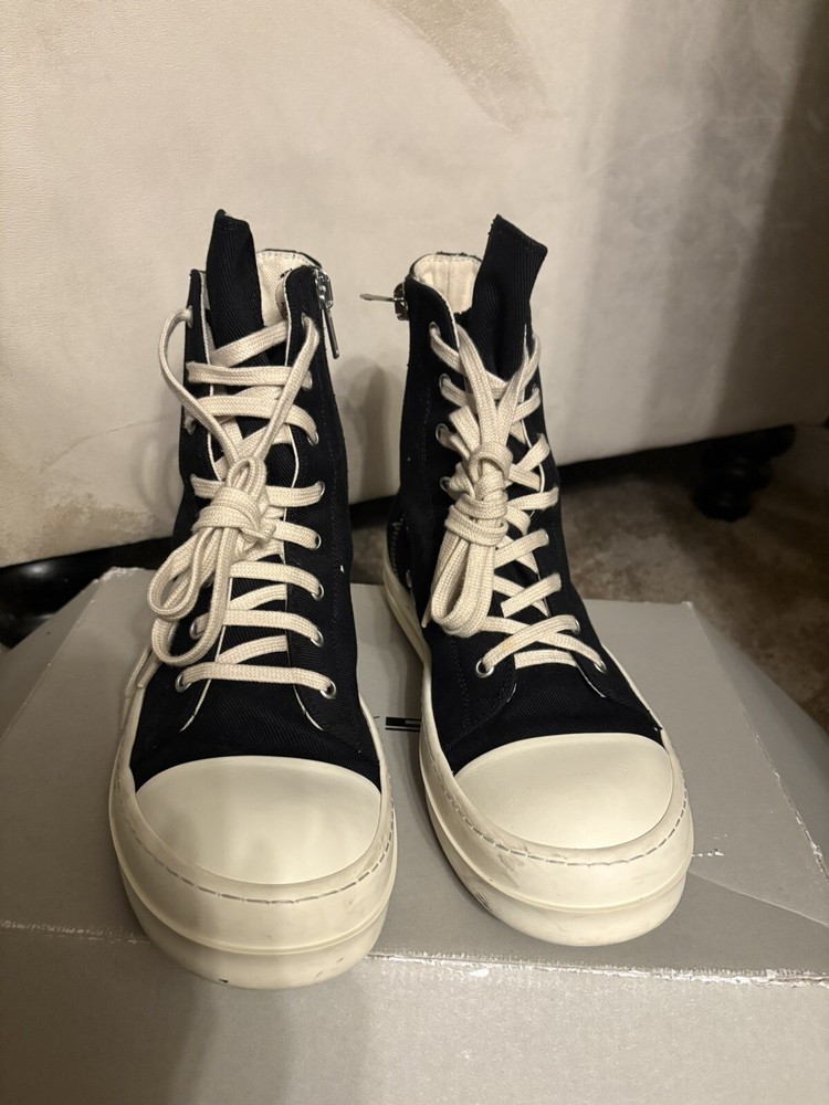 Black Rick Owens DRKSHDW zip fastening hightop canvas sneakers. These fashionable sneakers are gently used. This is a unisex shoe: Mens 8us / Womens 10us