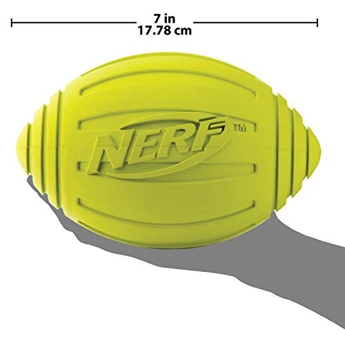 Product Description Down. Set. Hut!!! It’s game day every day with the Squeak Football. Perfect for a pick-up game in the backyard with your favorite mutt, this football is constructed from extra strength interactive rubber and features a gripped design to make it easy for humans to toss and dogs to catch. squeeze is all you need to hear that squeaker sound that dogs love! The Nerf-quality materials make this dog toy lightweight and durable so it’s great for indoors and outdoors. It’s made of water-resistant, 100% non-rubber so it's safe for pets and it’s the perfect toy you can take to the park, beach or lake, too. When it gets dirty from outdoor play, simply rinse or wipe off and it's good to go! From the Manufacturer Dogs will love to squeak and shake their brand new Squeaker football! This high performance dog toy is designed for demanding use by both you and your pet. It features a high bounce, high buoyancy, high visibility and high durability. The Ridged Squeaker Football is a durable rubber, interactive toy. 6 inches long. Available in various colors. NERF-TOUGH: Nerf-quality materials make our Ridged Squeaker Football perfect for fetch and for teaching your dog new tricks HIGH VISIBILITY: The bright green football is easily trackable for both you and your pet, no matter where or how far you toss it MADE TO LAST: Lightweight, durable, and weather & water resistant FOR MEDIUM AND LARGE BREEDS: With a 7 inch diameter, this football is ideal for medium and large breeds SAFETY FIRST: Designed with your dog's safety in mind, each of our dog toys are tested to ensure endless hours of family fun