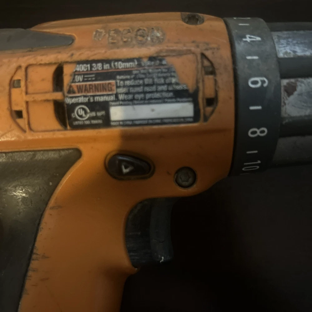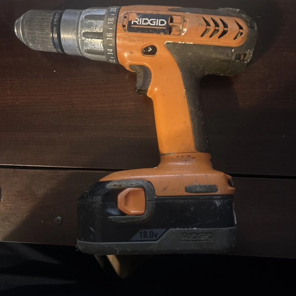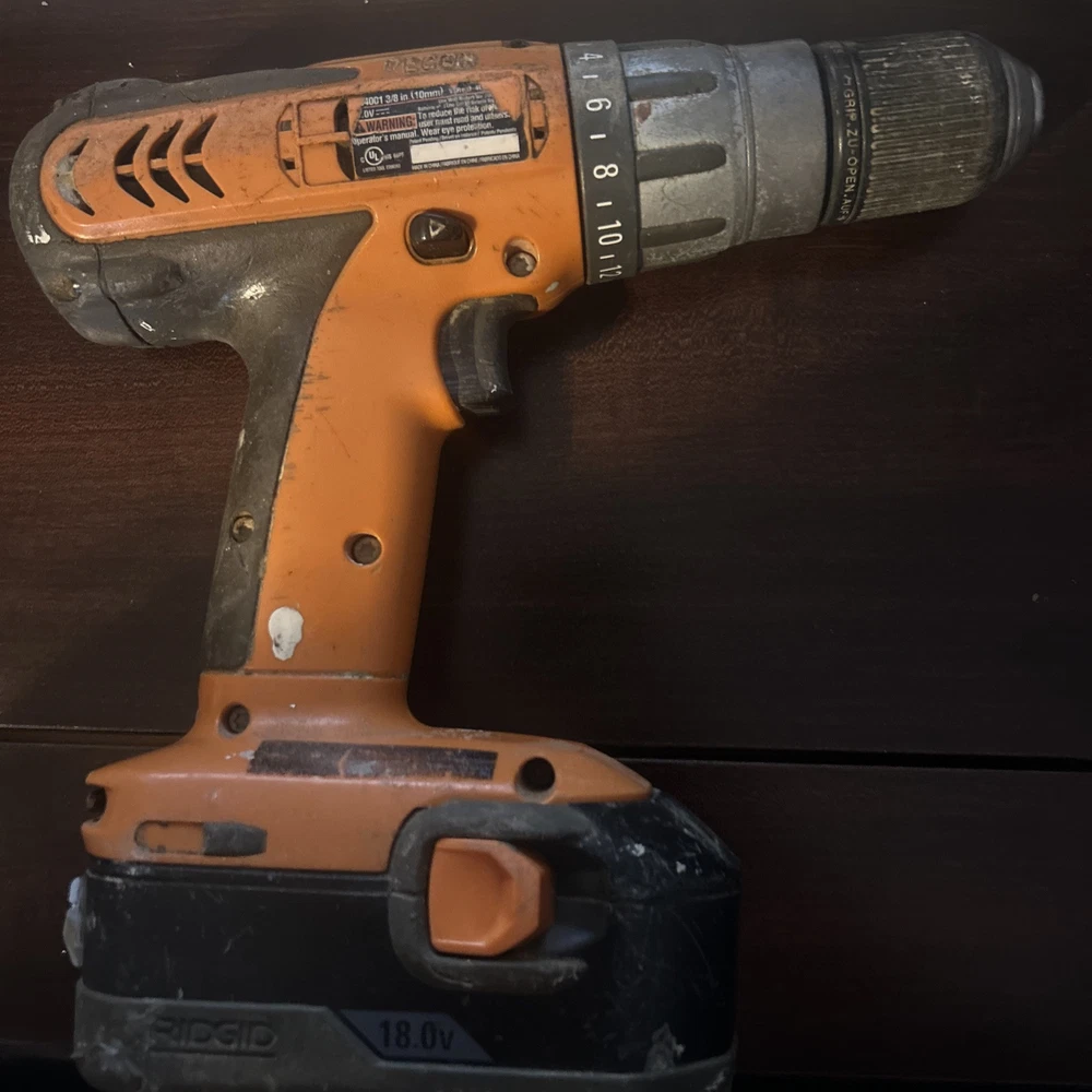 This is a Ridgid R84001 3/8 VSR Drill/Driver, a cordless tool that operates with an 18V battery (included). The set includes the drill driver only, with a keyless chuck size of 3/8 in. It is orange in color and does not come with an auxiliary handle. The drill is made by RIDGID in China. Please note that the battery's functionality has not been tested.